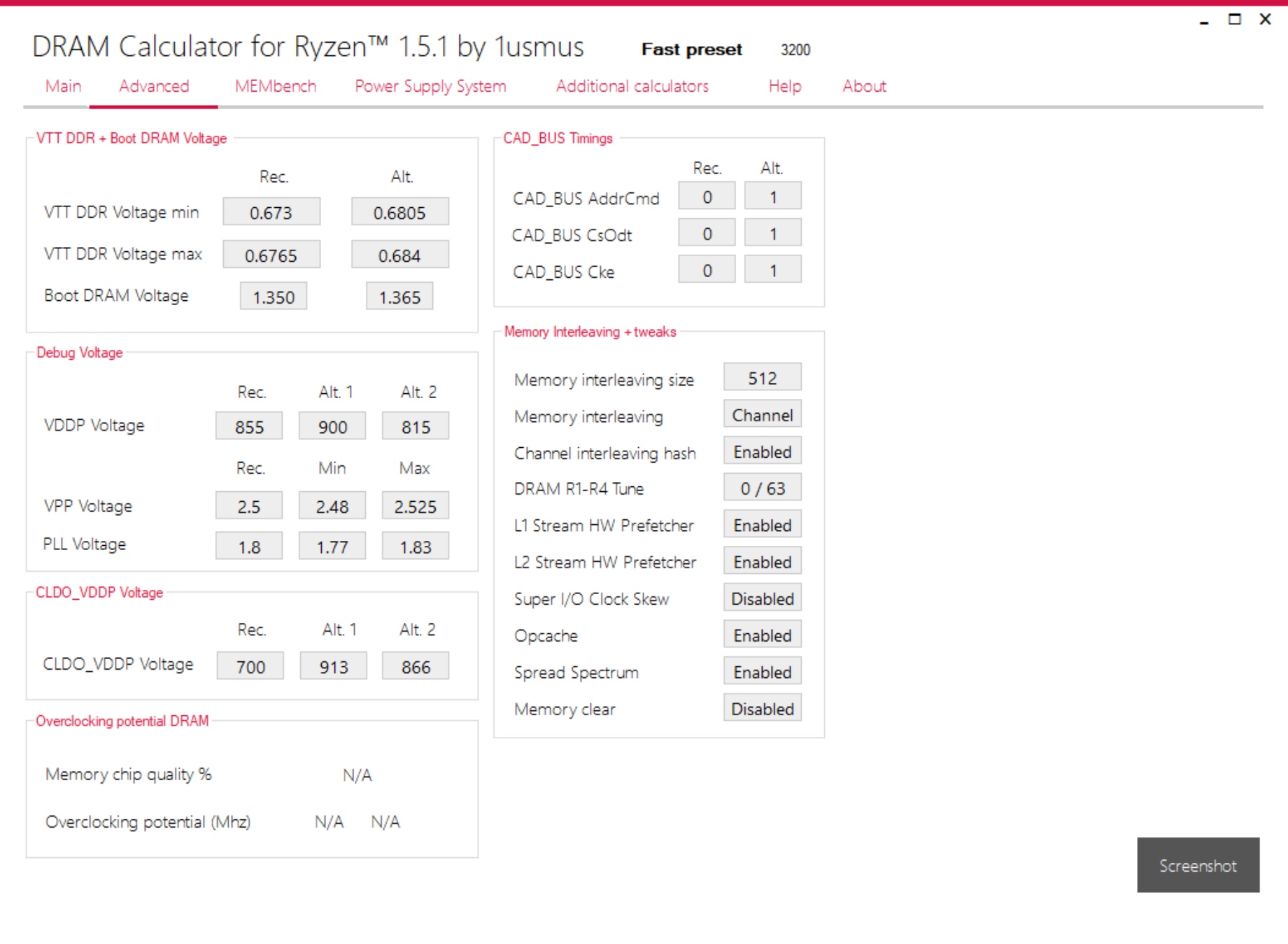калькулятор для TB1 только на 3200 для старта пойдет, на 3333 с калькулятора сильно отдаленно все, может даже не стартовать на 3333 у меня вольтаж на память 1,44, ниже ошибки, не рекомендую платы типа M Steel legend (Asrock зажал в топовой B450M) - там вольтаж 1,4 максимум в биосе и шаг гиганский. И вообще у меня на ней 3200 только на C18 стартовали, возможно плата глючная, но по DRAM реальное ограничение.
