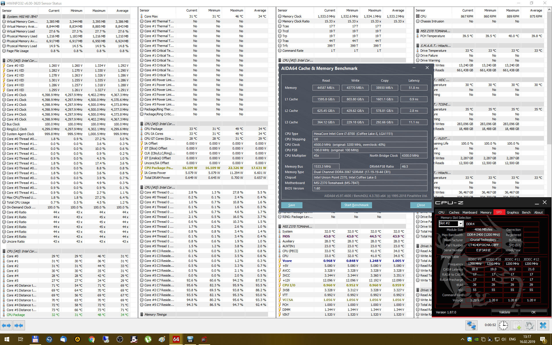 Оперативная память F4-3200C14D-16GTZR. Напряжение: DRAM 1.40v, SA 1.115v, IO 1.1v Разгонал до 3600 15-15-15-30 CR2. Стресс тесты вроде все проходит без ошибок. 4000 вроде память брала, но никак не мог подобрать таймингов, тоже самое с 3800. Думаю если бы процессор был 8700к, то было бы легче гнать до 4000. Смысла мне кажется дальше гнать нет, так как разница будет небольшая да и то в синтетике. Компьютер используется для игр. #77