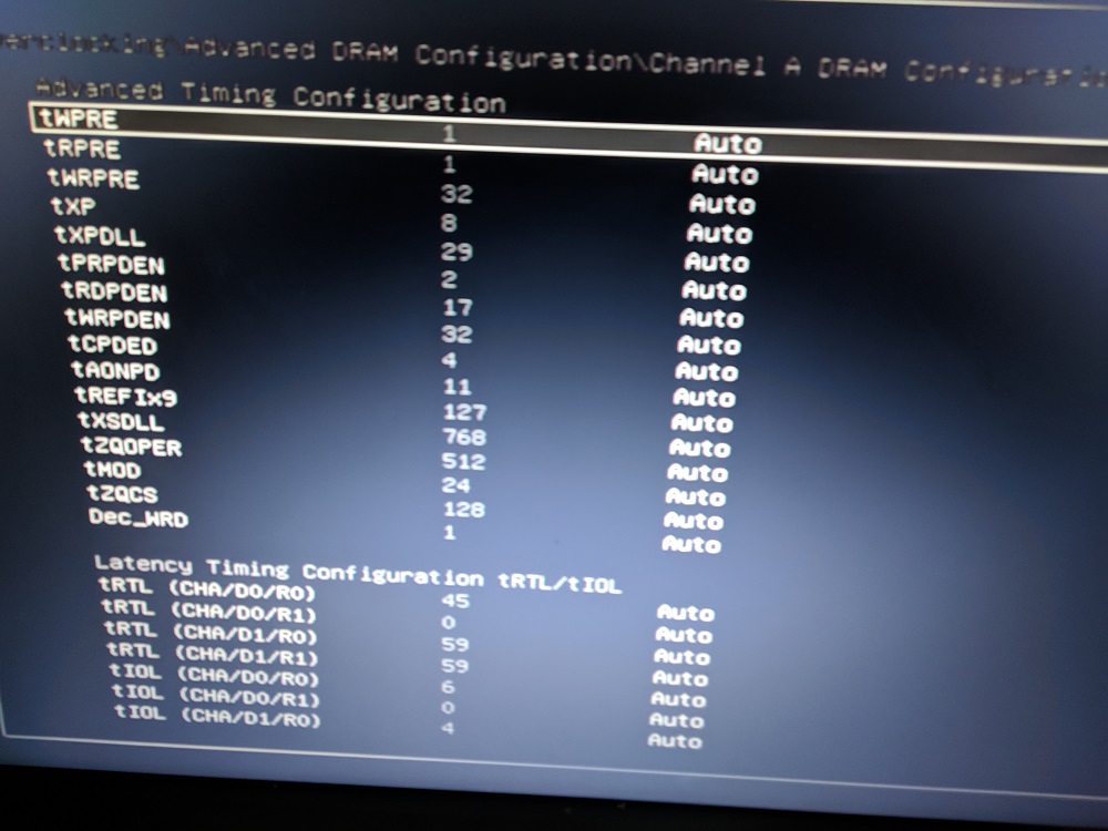 Ramforce, tRRDL=6 сделал, без разницы. СR2 сильно задержка возрастает судя по AIDA64, и так конская 55. И плата по дефолту выставляет CR1 тоже А это что за блоки настроек: "Advanced Timing Gonfiguration" и "Latency Timing Configuration tRTL / tIOL, там всё на "авто". И для второй планки вообще нули показывает, может там касяк? Или это ни на что не влияет?