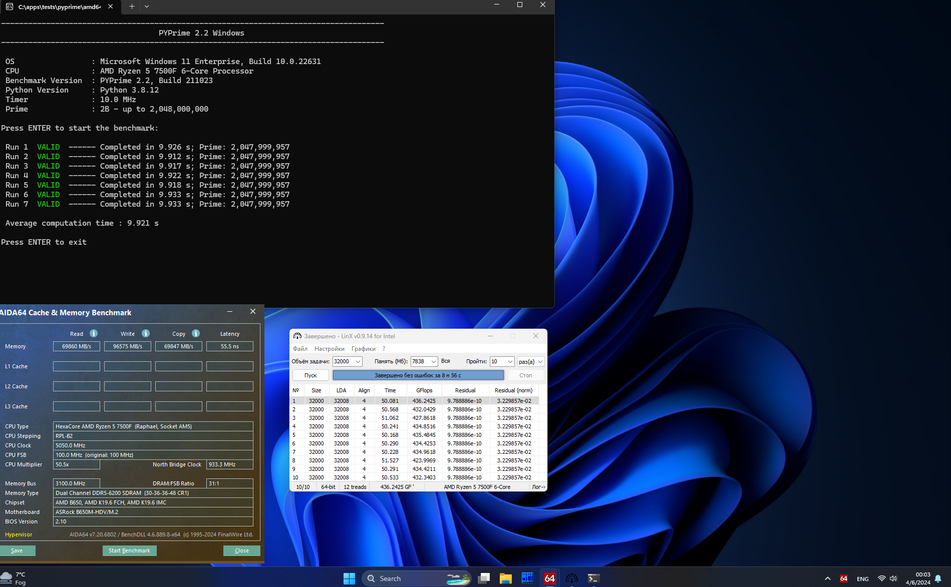 OS : Microsoft Windows 11 Enterprise, Build 10.0.22631 CPU : AMD Ryzen 5 7500F 6-Core Processor Benchmark Version : PYPrime 2.2, Build 211023 Python Version : Python 3.8.12 Timer : 10.0 MHz Prime : 2B - up to 2,048,000,000