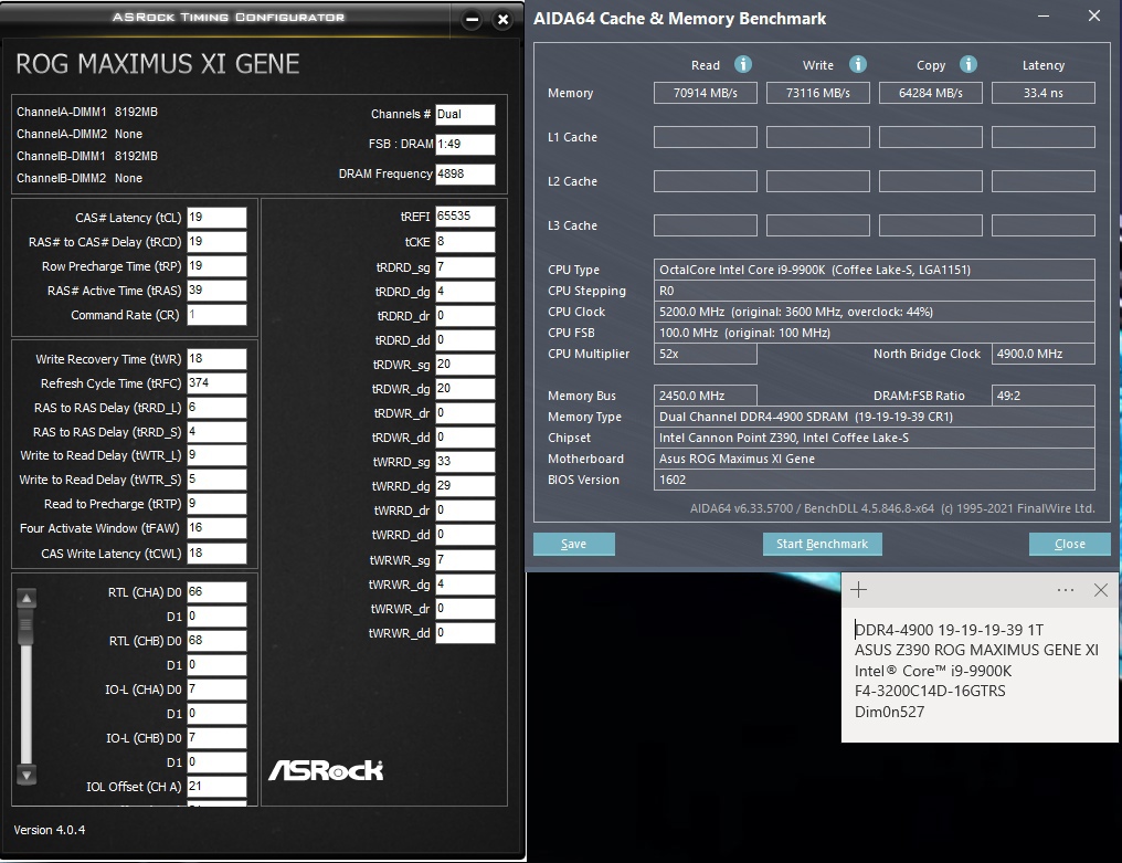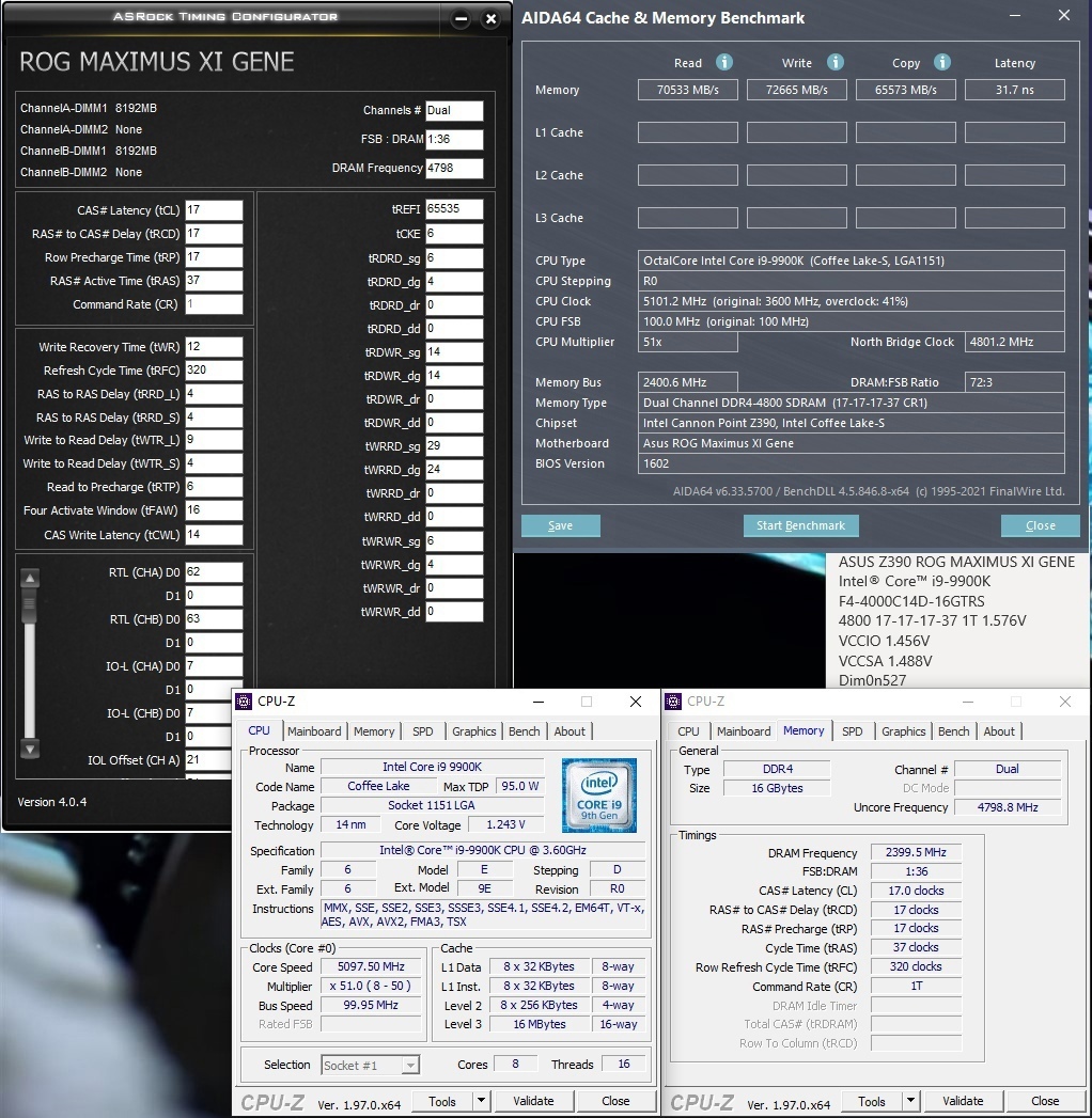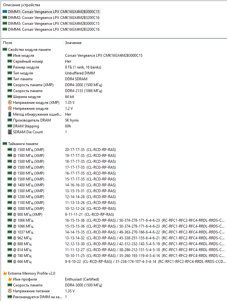 Доброго времени суток, уважаемые знатоки) Имею i7 9700 + ASROCK B365M pro4 + 8gb x 4 планки DDR4 памяти Corsair (2 на самсунгах 3200 + 2 на хьюниксах 3000) = 32Gb. Разгона нет никакого на данном чипсете и процессоре - поэтому задача была немного оптимизировать тайминги. Почитал теорию, выставил основные (на мой взгляд) тайминги 14-16-16-32-1T-480-20800 на напряжении 1,300V. Остальные тайминги в авто, на усмотрение матплаты. Работает вроде стабильно, но немного смущает большая разница в показателях чтения и копирования. Вопрос: 1. нормальна ли такая разница в показателях чтения и копирования? 2. правильно ли настроены первичные тайминги "по науке"? (выбирал специально четные тайминги, почитав посты anta777) 3. нет ли каких то явно завышенных вторичных таймингов, так сильно влияющих на показатель чтения?