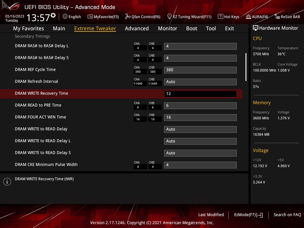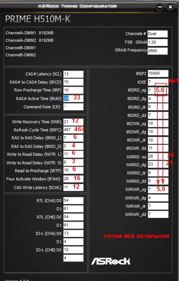 tWTRS/L устанавливаются в биосе через tWRRDdg/sg согласно формуле: tWRRD_sg=6+tCWL+tWTR_L tWRRD_dg=6+tCWL+tWTR_S tWR(асроковский) - через WRPRE: TWRPRE=4+tCWL+tWR tWR=2 х tRTP tRDPRE=tRTP а DRAM WRITE Recovery Time =tWR-1 для tWRPRE=tWRPDEN tREFIX9 = на макс OREF_RI = на мин