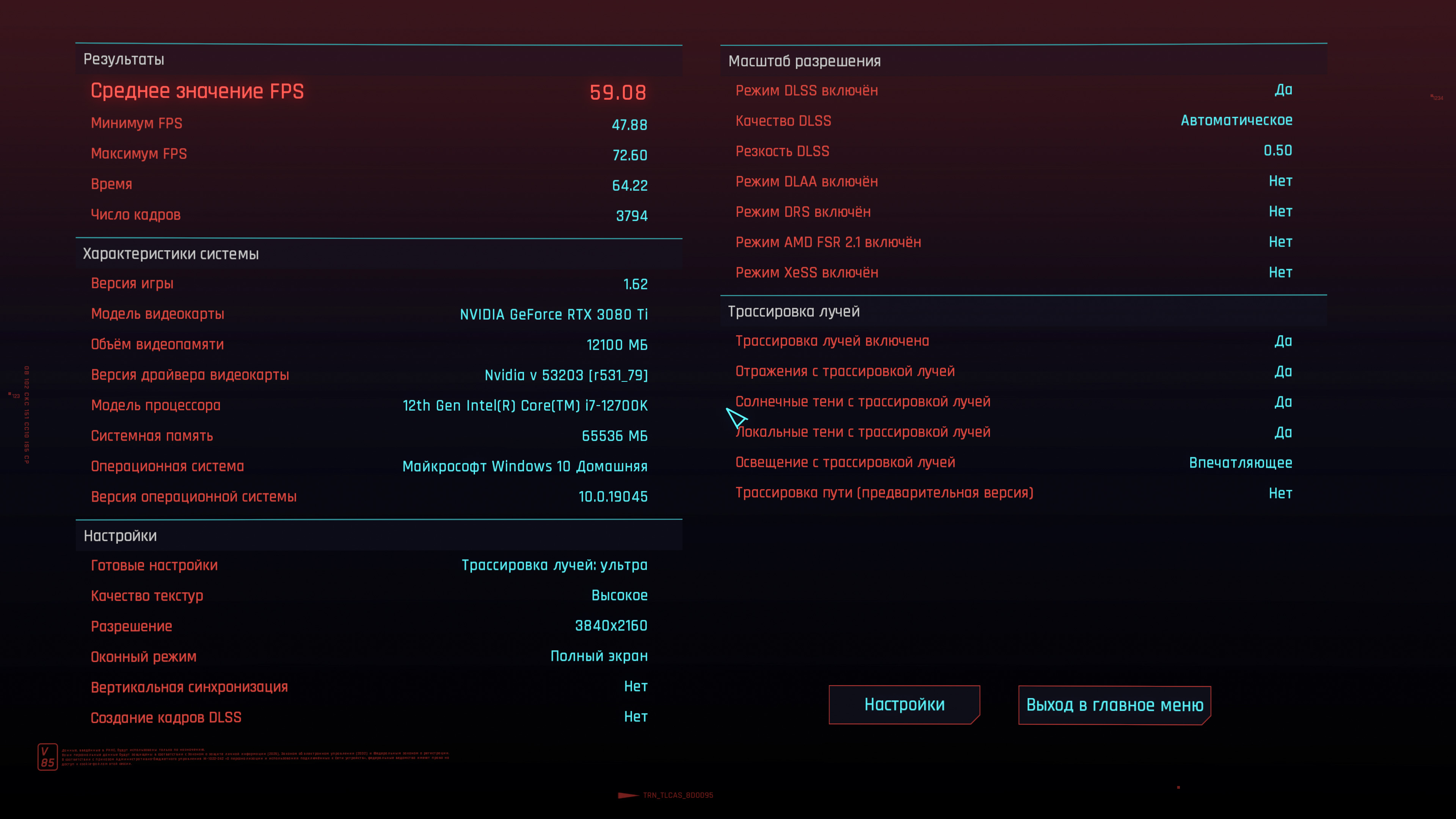 Можно добавить объем оперативной памяти до нормальных 64 Гб. Гнать до таких частот и таймингов абсолютно бессмысленно с точки зрения производительности в играх, например. Если играть в нормальных разрешениях с высоким качеством. Недавно провел измерения на своих бидаях (у меня 4 плашки по 16 Гб, поэтому выше 3600/16-16-16-36 не забирался, напряжение выше 1.35 не поднимал). Cyberpunk 2077 Patch 1.62 Overdrive, разрешение 4к, отличная играбельность с практически стабильными 60fps в игре почти без просадок. Смотрим на цифры и ищем разницу в среднем, максимальном и минимальном fps. 1. JEDEC 2133/15-15-15-36 2. XMP1 3200/14-14-14-34 3. Разгон 3600/16-16-16-36