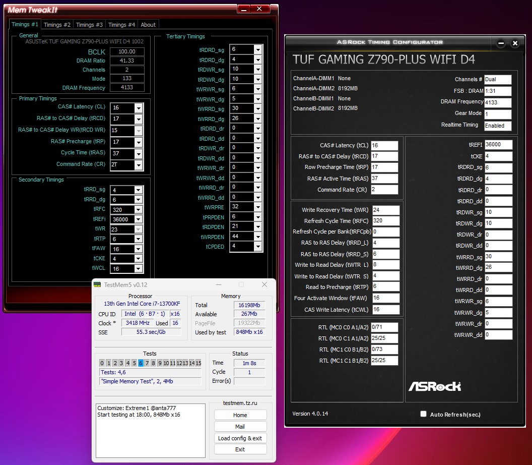 что-то на 13700к мой разгон памяти просел по сравнению с 9700к. Причем, самым неожиданным и некрасивым образом. Самые важные тайминги: tRDRD-sg/dg и tWRWR-sg/dg прибавили по единичке. и теперь 7 и 5 вместо 6 и 4. Из-за этого на частоте 4133 скорость как на 3600.