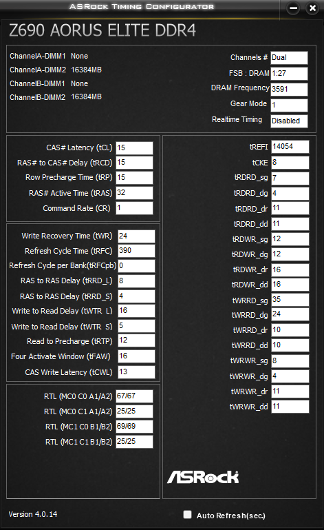 Anta777, живая легенда, подскажите, пожалуйста, при данных таймингах и конфигурации ПК, что можно ещё улучшить? VDDQ = 1.25 V, Dram Voltage = 1.45 V, cl14 - не идёт при таких таймингах. Плашки дуалранки, 16*2, стоят в А2В2. Тайминги при 133, gear 1, CR1, XMP - Disable.