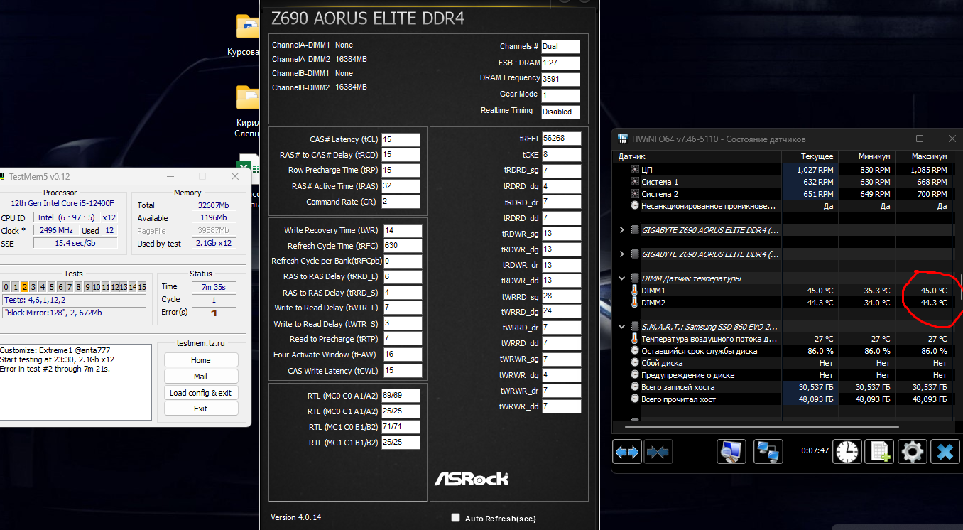 Кстати, по поводу этого, я это понимаю, но если одно, датчик в прошлом тесте на полтора часа максимальную температуру показывал 47.3 градуса, а значит такую же, и даже выше, чем тогда, когда выпадали ошибки. Конечно, там неравномерное распределение, и всё такое, но что-то как-то странно это всё. Может 12400f просто уже с такими параметрами не вывозит 3600 частоту?