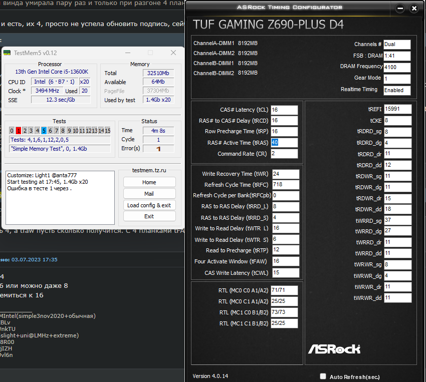 Всё немного иначе, тайминги тут не настраивалась, кроме первичек. Целью был поиск соотношения максимальной частоты к таймингам и всё пошло не по плану. Ну во первых, хочу сказать что скинутый мною ранее тест где CL15 4000 больше двух часов без ошибок идёт не является подделкой, тест действительно столько шёл. Однако при реальном тестировании выяснилось, что всё не так однозначно. Сначала всё было хорошо, я прогоняла вторички одни за другим, в какой-то момент добралась до tRDD sg и dg и вот отсюда не заладилось, тест начал проходить с ошибками, причём почти сразу. Тогда я убрала предыдущий настроенный тайминги, но это не помогло. В итоге дошла до того, что абсолютно все вторичные тайминги были в авто, ошибки остались. Более того, спустя не один десяток перезагрузок, некоторые из них были не успешными, а в остальных случаях крайне долгими. Я уже не в первый раз замечаю за этой платой такое поведение и это именно плата, не процессор. В какой-то момент при достижении определённых частот плата долго не может оттренить память и тут уж как повезёт. Какое-то время спустя винда не выдержала таких издевательств и просто погибла, прям насовсем. В итоге накатила её заного, запустила тест 4266 CL16 и сразу тонны ошибок, далее запустила 4000 CL15 и сразу ошибки, но правда уже нет долгого тренинга при включении. Похоже уважаемый anta777 вновь оказался прав. Сейчас тестирую 4100 CL16, пока ошибок нет и старт очень быстрый. Полагаю что победить плату можно и какой-нибудь матёрый оверклокер осилит 4266мгц, но я слишком нервная для такого дерьма. Меня 4100CL16 устроит, если не найдётся подводных. PS SA пробовала крутить вплоть до 1.35 Память 1.5в под обдувом, дело не в напряжениях. Я уверена как никогда. не вывозит плата.