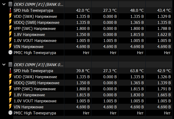 Подскажите, в чем может быть дело: использую сейчас комплект 2x16GB (OEM Hynix M-Die) на 6200CL40 с VDD=1.35 В, в тестах температура держится не более 53 град. без радиаторов (позже поставлю), но моментами HWINFO64 ловит всплески температуры до 63,8 град. До этого был комплект на таких же чипах от Kingston (уже с радиатором) - была такая же ерунда - моментами температура фиксировалась на уровне 63,8 град. На графике температуры этот всплеск видно в виде свечки вверх.