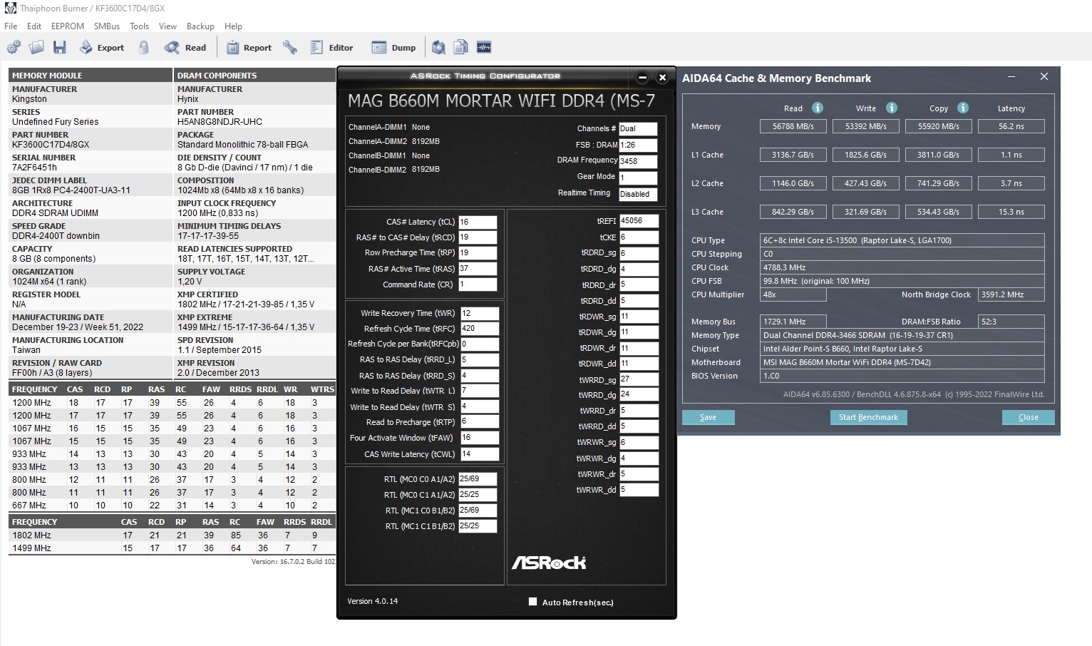 Всем доброго времени суток! Soyo Saga | Maxsun Terminator B660 + i5 12400F Модули 4 по 8Гб Netac Shadow 3600 cl16, чипы ChangXin Tech. XMP заводится, но не стабильно. Если вручную правлю тайминги, то все равно проскакивают ошибки. Видимо 12400F не справляется с 4мя модулями... Настроил 3200, работает стабильно, результат на скриншоте. В CR1 не запускается. Нормальные показатели или может еще что-то подкрутить?