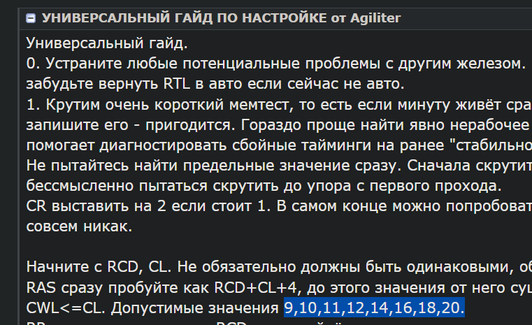 Универсальный гайд. 0. Устраните любые потенциальные проблемы с другим железом. Снимите разгон с видеокарты, снизьте частоту цп на 300 с сохранением напряжения. Не забудьте вернуть RTL в авто если сейчас не авто. 1. Крутим очень короткий мемтест, то есть если минуту живёт сразу снижать тайминг дальше. Ищите не стабильность, а явно сбойное значение тайминга, запишите его - пригодится. Гораздо проще найти явно нерабочее значение и от него плясать чем пытаться ловить нестабильность часами. Это также помогает диагностировать сбойные тайминги на ранее "стабильной памяти". Не пытайтесь найти предельные значение сразу. Сначала скрутите до +2 от минимально стабильного. Многие тайминги идут параллельно поэтому бессмысленно пытаться скрутить до упора с первого прохода. CR выставить на 2 если стоит 1. В самом конце можно попробовать скинуть до 1. 3 Ставить только на очень большую частоту или если по другому ну совсем никак.
