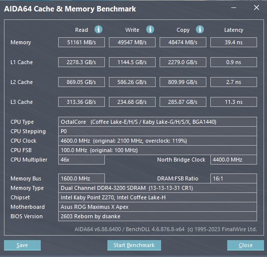 CPU Name: Intel® Core™ i7-7740K CPU @ 4.30GHz Motherboard Model: MSI X299 GAMING PRO CARBON AC (MS-7A95) Total Size: 8192 MB Type: Single Channel (64 bit) DDR4-SDRAM Frequency: 2750 MHz - Ratio 1:31 Timings: 21-31-31-63-2 (tCAS-tRC-tRP-tRAS-tCR) Slot #1 Module: G.Skill 8192 MB (DDR4-2137) - XMP 2.0 - P/N: F4-3200C14-8GVR