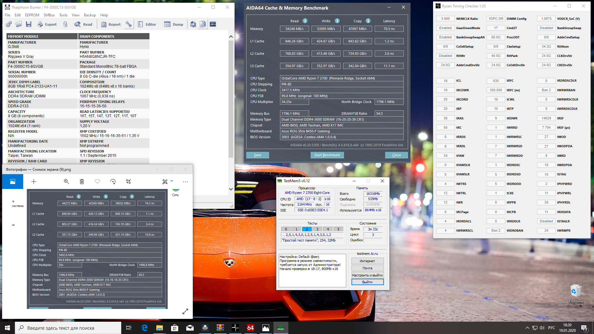 Всем привет, прошу не кидаться в меня тапками заранее)) Имеется память G.Skill Ripjaws V Gray, пытаюсь разогнать её на мат. плате R.Strix B450-F Gaming, однако не совсем получается, попытался завести на 3600, но напрягают высокие тайминги и высокое напряжение на памяти, при понижении U до 1.4 - 1.43 вываливаются ошибки, на 1.45 все стабильно, и как видно, латентность так же не фонтан, куда копать, что можно ужать или наоборот может накинуть куда? Лопатил инфу на hardwareluxx конкретно по данному типу памяти и ни на одних из подобранных там таймингах память адекватно не заводится, либо заводится, но вываливается громадная куча ошибок и синий экран. Понятное дело, что я что-то не так делаю, ибо другим удается её и до 3800 гнать, при этом еще и латентность скинуть до 62ns, прошу вашей помощи)