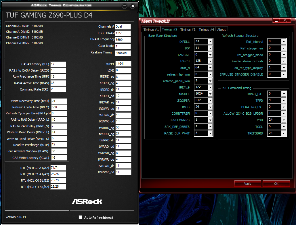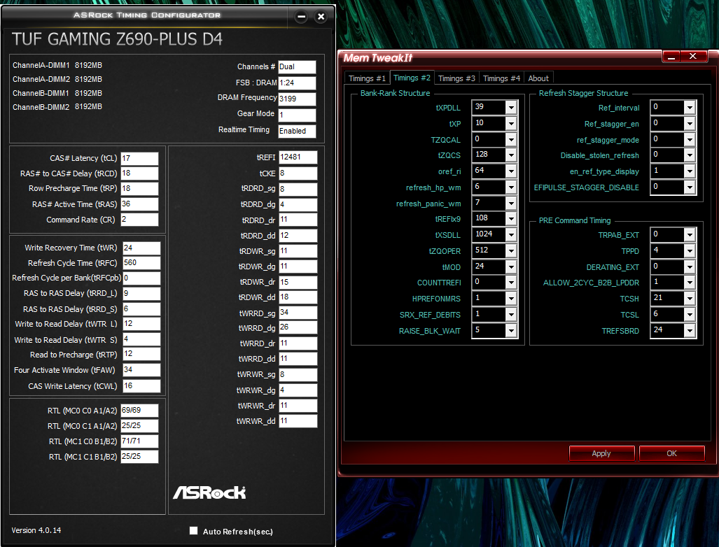 AMT - Asus MemTweakit Asus MemTweakIt 2.02.44 При настройке памяти в BIOS ставим ОБЯЗАТЕЛЬНО MRC Fast boot=disable (включаем при этом режим тонкой тренировки, если же выставим enable, то включаем режим грубой тренировки). Оптимально при разгоне памяти использовать в биосе множитель памяти 133, а не авто или 100, что даст возможность создать комфортные условия для контроллера памяти в процессоре и снизить напряжения ио и са ! Недаром в Jedec шаг между спидбинами именно 133, а не 100! Для плат с Alder Lake напряжения VDD и VDDQ на память могут отличаться не больше, чем на 300 мВ. Для плат на основе логики z690 и b660: VDD>VDDQ VDDQ>=VDD-300mV(0.3V) Лучше на VDDQ не превышать 1.25V. Вполне возможно 1.30V. MSI дает зазор до 1.40V. Для таймингов должно выполняться требование: _dr=_dd