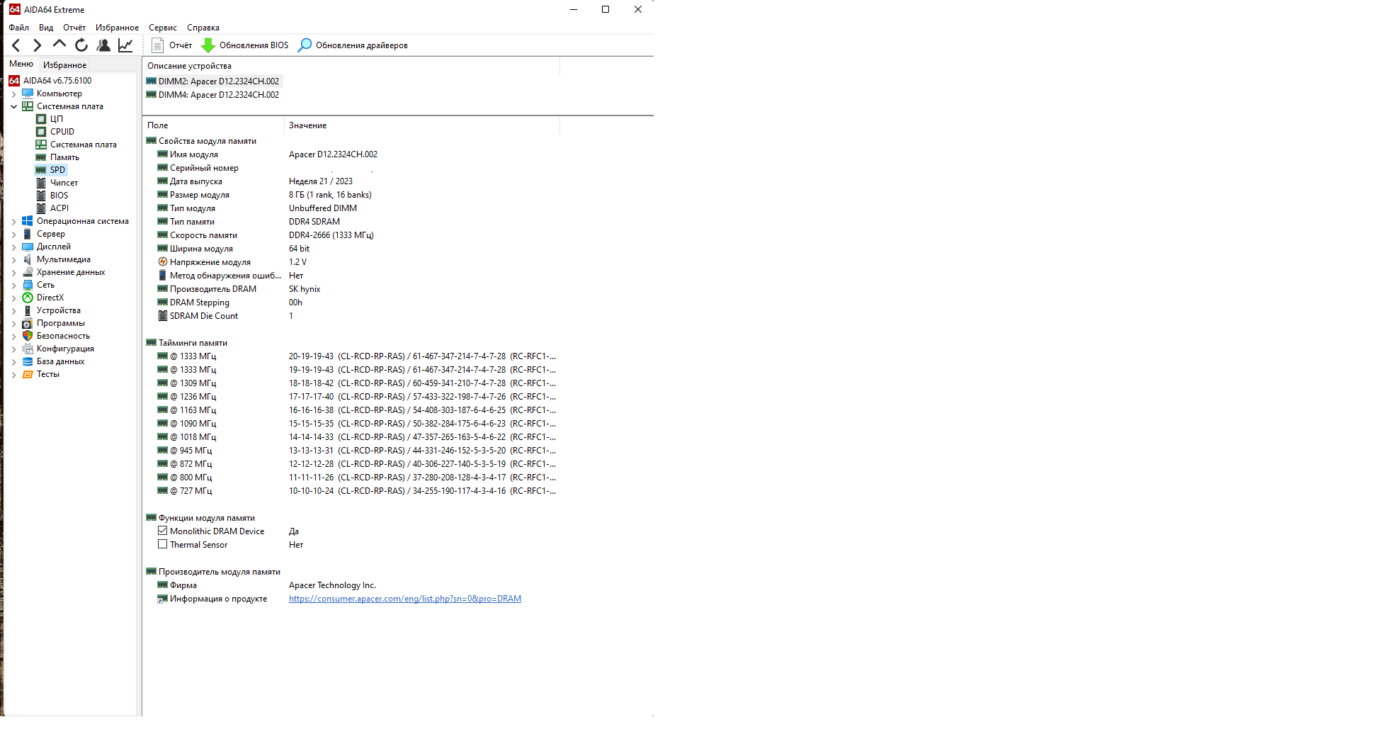 По халяве купил памяти apacer AU08GGB26CQYBGH DDR4-2666 taiphoon, cpu-z, AIDA64 определяет, как SKhynix. На 12100F + MSI H610 на 3200 (Любые тайминги) на 1.2В не стабильны, TM5 выдал ошибку. В стоке на DDR4-2666 все нормально. На 1.35В, вроде бы легкий тест TM5@serj на 16-18-18 прошел. С Hynix'ом я очень мало имел дело, но знаю, что DDR4 у них отличная, могут ли все 3 проги ошибаться, и по факту, там какой-нибудь spectek или какой-нибудь дубовый micron?