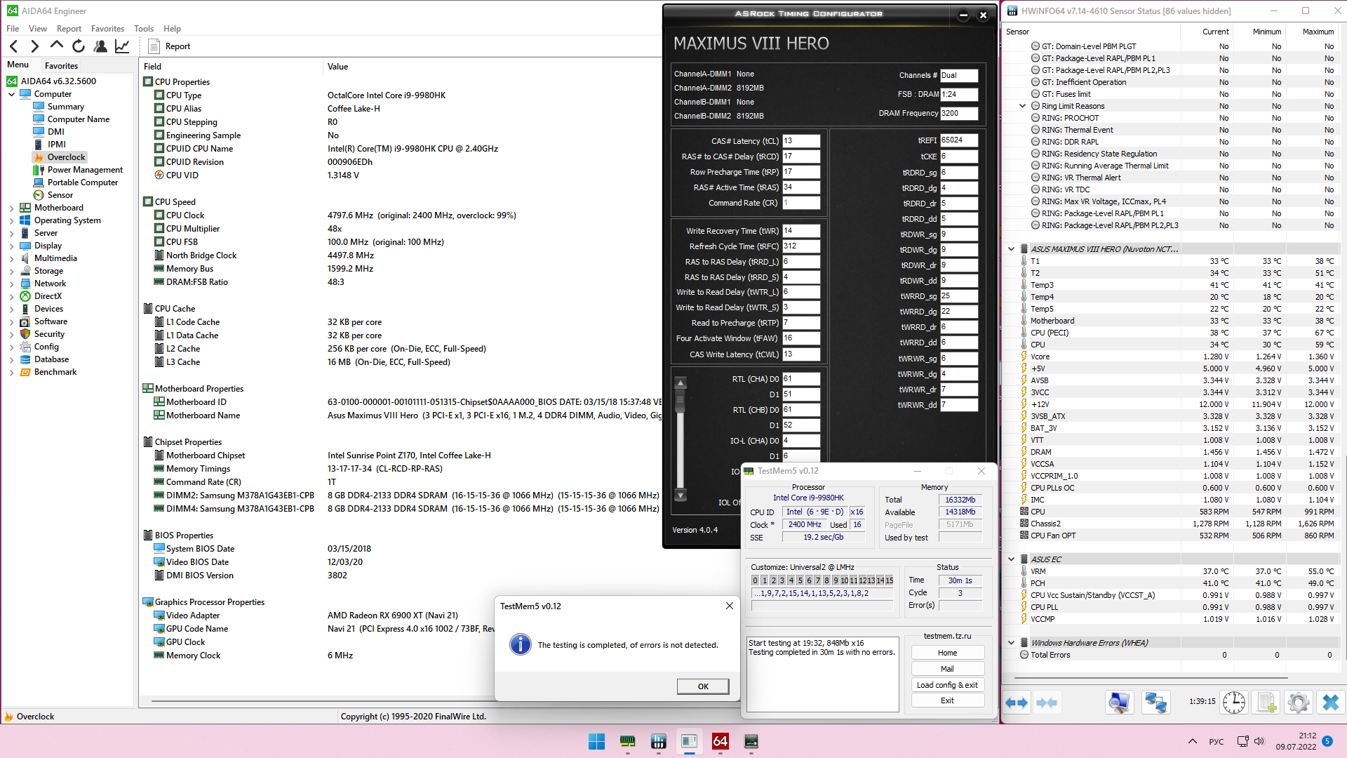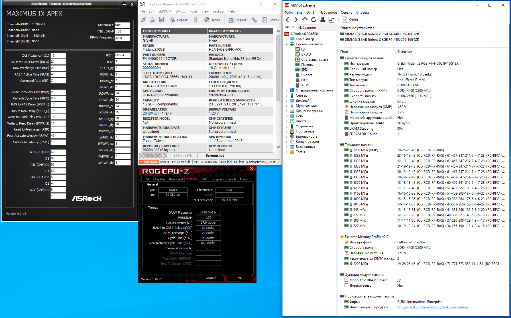 Всем привет. Хотел бы попросить помощи, бо времени совсем нет погрузиться полностью в настройку памяти. Предыстория: Не было компа года 3. Сейчас опять решил подсобрать себе машинку чисто для пары игр. Собирал по бичу из того что было. Была asus apex ix модифицированная с кофемодом, 8700k - эта база провалялась 2.5 года. Подкупил еще железок и на последок взял память. На сколько я помню раньше высокочастотные планки были в основном на чипах samsung b-die, поэтому увидел частоты - взял не раздумывая кит 2х16 g.skill. Еще и подумал что он двуранк(Дурак, что не прогуглил). Оказалось что это одноранковый мусор на Hynix. Что хочу сделать: Выжать все соки из этой памяти. Если этим не стоит заниматься, бо память совсем убогая - так и напишите. Покупать другую уже не буду, мне проще комп продать и собрать потом другой. За такое время отсутствия столько железок вышло, что мои нынешние - совсем дрова... Прикладываю инфу о моем конфиге. Заранее спасибо всем, кто откликнется. Чуть не забыл. Планки больше 4000 не едут никак. Проц 5ггц 1.33в, все энергосберегающее выключено, в настройках питания все выкручено в максимум. Память 1.5в SA 1.35, IO 1.3