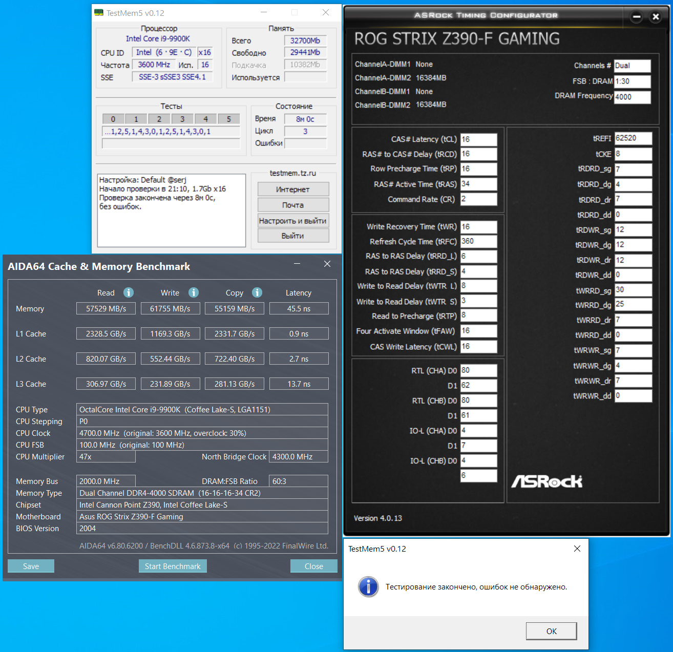 Всплывающее окно приложения: TestMem5 v0.12 : The testing is completed, of errors is not detected.