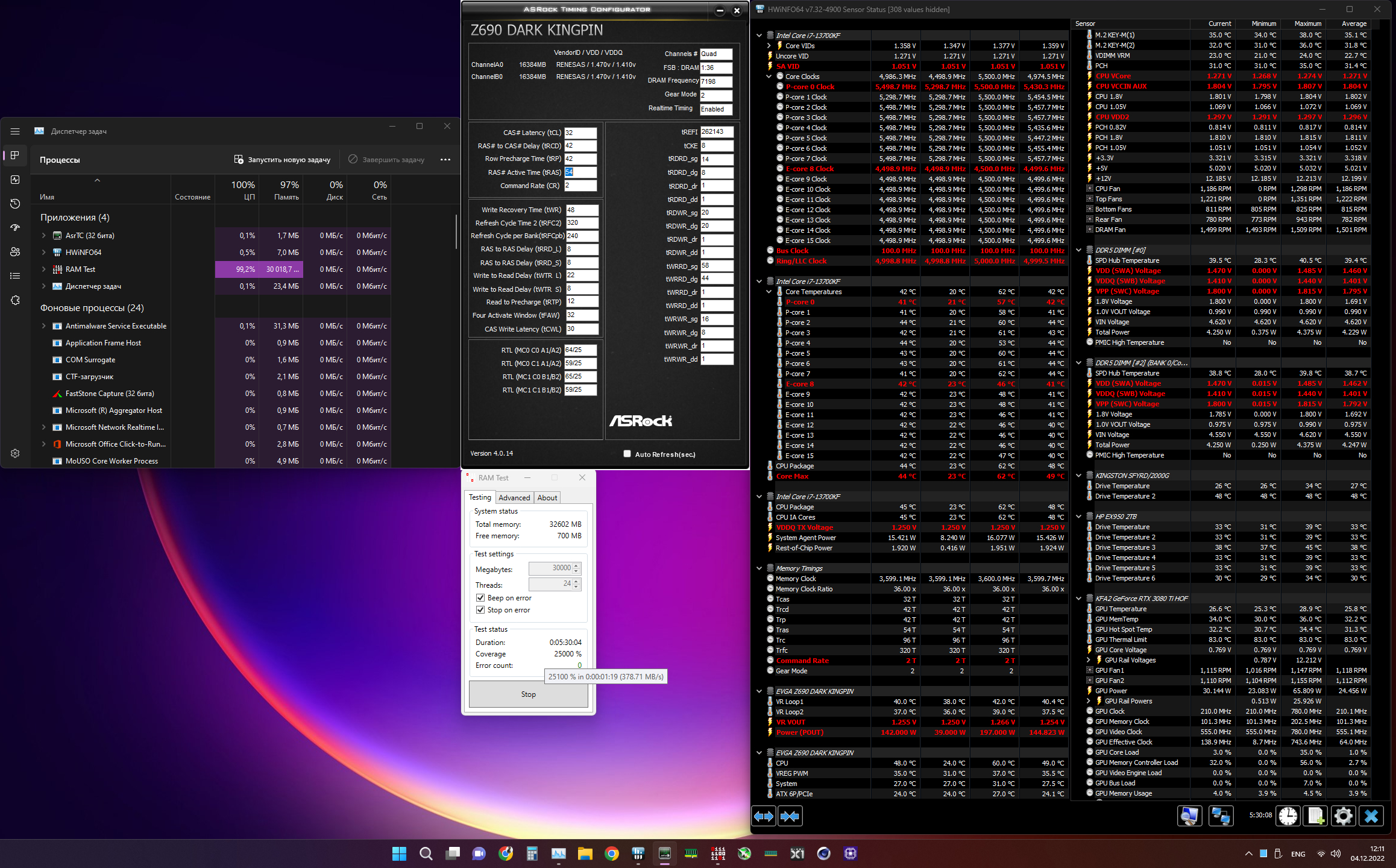 P.S. Наверняка, SA и DRAM VDDQ ниже будут, но мне так лень... За CPU VDD2 не знаю, 1.3 и так нормально. Короткие тесты 1.25 проходит, оставил как есть. tRDRD_sg=13 также вроде ок, но 14 поспокойнее, tWRWR_sg=16 для тестов (заодно проверил на стабильность), tRDWR ниже 20 ошибки, хотя иногда 17 нормально ходит, tWTR_L=20 ошибки, RTL оптимизирован... Сегодня, возможно, возьму A-Die потестить на новом биосе как раз (правда там с процом какие-то недочёты, заодно и проверю, но все отзывались о хорошем бусте памяти). P.S.S. Надо бы винду поставить на 980 Pro, а не на HP + оптимизировать