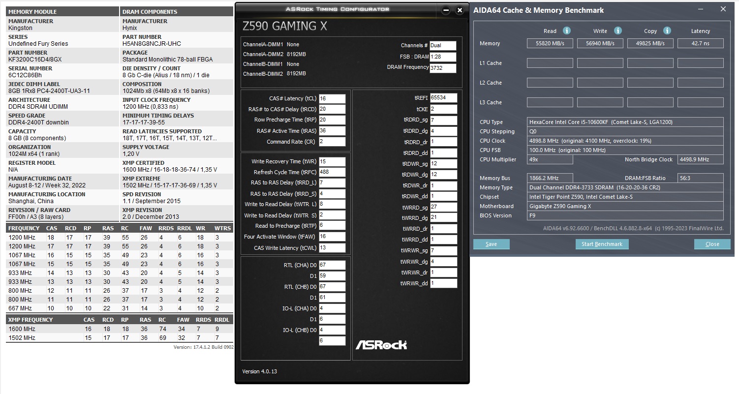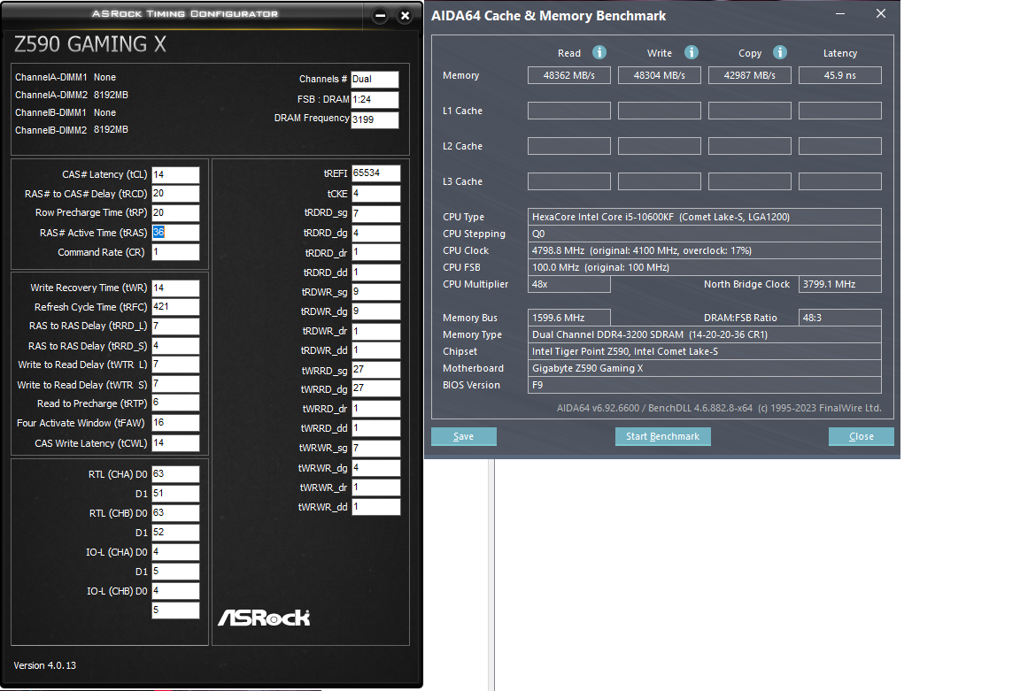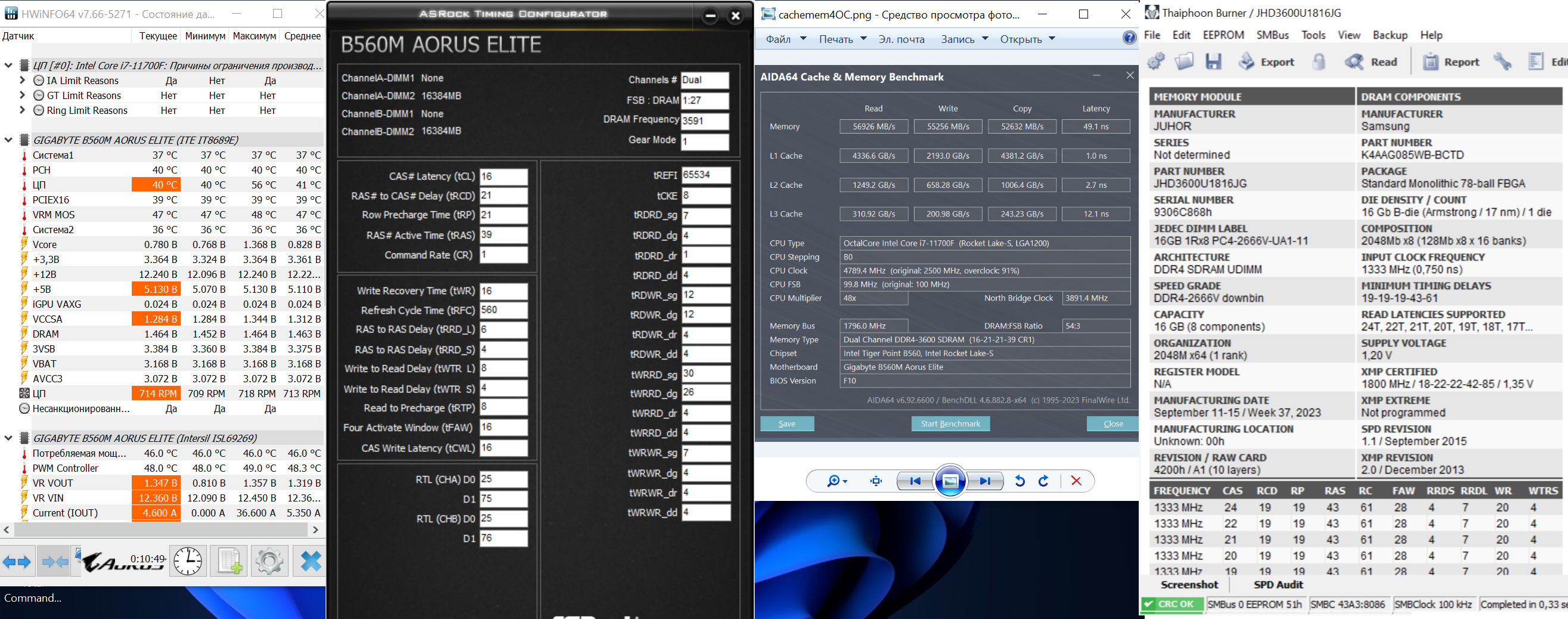 Категорически всех приветствую,вопрос таков.Чипы Hynix CJR,VDIMM 1.37,10600kf 4.9 1.18v,Gigabyte Z590 Gaming X.Можно как-то допилить задержки?Скрин прилагается,если есть какие-то идеи,то буду благодарен.Сразу скажу RDWR не едут ниже 12,по tWR уперся в лимит платы(у меня скручивается только через twrprden),tRFC также ни в какую,всё что ниже 488 сразу ребуты до биоса,RTL/IOL ниже также не едут,пробовал(хотя на прошлой B560M H можно было опустить до 5).