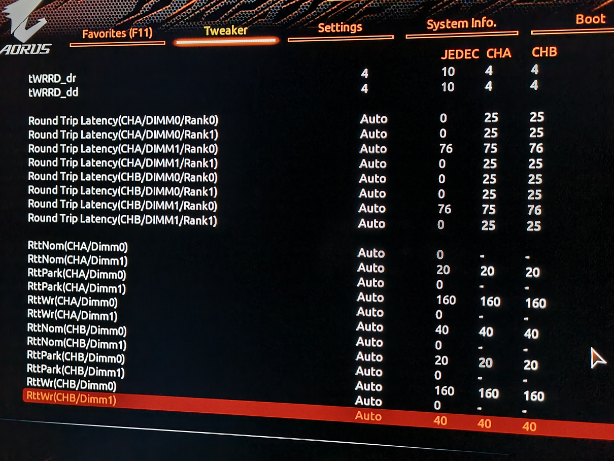 Alexshanghai Так у вас тайминги проставлены не верно процентов 30: TCKE 4 мало на такой частоте (авто), TRDWR должны быть все одинаковы по 13 лучше по 12, TWR откуда 20? ставте 18, TRTP соответственно 9, TReFy в авто, ищется в последнюю очередь, как и TRFC его тоже ставят в авто(ищется по таблице в последней вкладке ставвите вашу частоту и ищите в таблице значение для ваших чипов Micron E-die), напруга на контроллер IO маловата 1,2 минимум, дальше по таблице tWRRD _sg _dg старайтесь что б было отличие на 4 такта, а не на 5 как увас(не могу щас посмотреть так как офис не стоит) по ним ставиться tWTR_L и _S. Хотя б эти недочёты исправьте, а там дальше смотрите если что подскажу!!!