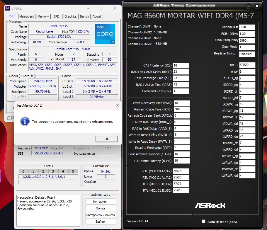 Pancher Отключил turn around timing optimize и выставил всё вручную. На третьем цикле, почти в самом конце теста была одна ошибка дважды. Оставил tREFI 65534 вместо 65535, прогнал ещё три цикла - без ошибок. Максимальная температура 44. Пока остановлюсь на этом, если в дальнейшем ещё что-то всплывет, повышу tRFC.