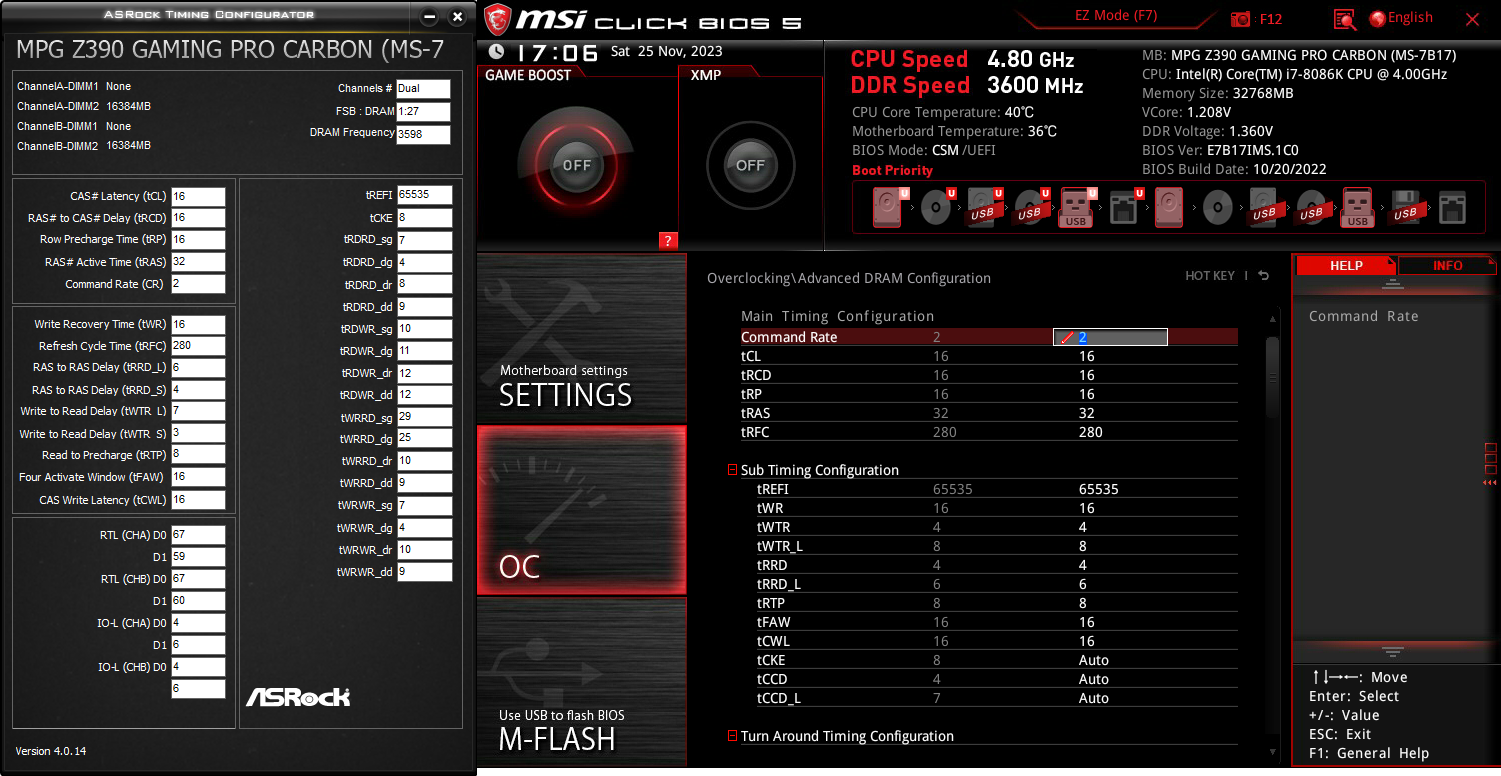 Всем привет! Обновился на свежие двухранговые g.skill trident z 2x16 b-die с целью увеличения объема озу в системе и разгона, соответственно. Сразу решил поднять частоту “выше xmp”, но новая память отказывается даже проходить пост при 4000cl19 @ 1.45 и VCCSA/IO 1.25/1.2 (в т.ч. на “авто”) и сбрасывает настройки платы. Более-менее вменяемой стабильности без ошибок (Extreme1 @anta777, 3 cycles) удалось достичь при 3600 16-16-16-32-280 с вручную выставленными вторичками при DRAM = 1.36, VCCSA = 1.2, VCCIO = 1.15. Читал, что на coffee lake (не refresh) не очень хорошо гонятся двухранговые модули объемом 16Гб. Цель: разогнать данные 2x16 до максимально возможной частоты с напряжением до 1.45 и ужатыми вторичками на такой системе. Изначально хотелось 4000 cl16 LT, но видимо не судьба с таким конфигом…