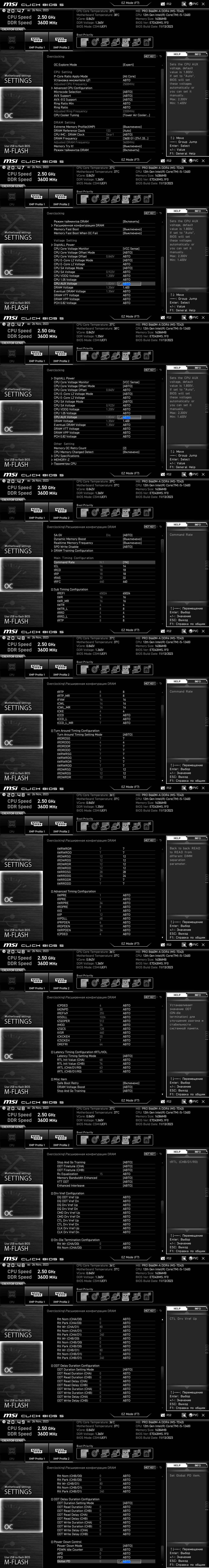 Всех приветствую. Выставил частоту 3466 в гир1 (16/18/18/38/CR2) остальное все на авто, в аиде запись/чтение/копир меньше 40т. Задержки 80нс. Это же не норм?! Что же я там такого не настроил? Возможно что просто не совместимость железа? Иногда каким то чудом бывает правильная производительность (после очередных ковыряний в биосе и 100500й перезагрузки) соответствующая выставленным частотам и таймингам, но лишь до перезагрузки компа. Так же надо сказать что с другой оперативкой, простенькая ddr4 Kingston на 2133мгц, таких странностей не было целую неделю пользовался, всегда стабильные результаты в аиде. Все железо новое. Доска: Asus prime z790m plus. Проц i5 13500. Оперативная память Kingston 32Gb DDR4 3600MHz (KF436C16RB1AK2/32) (2x16Gb KIT).