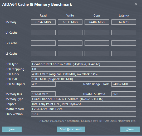 CPU Name: Intel® Core™ i7-7740K CPU @ 4.30GHz Motherboard Model: MSI X299 GAMING PRO CARBON AC (MS-7A95) Total Size: 8192 MB Type: Single Channel (64 bit) DDR4-SDRAM Frequency: 2750 MHz - Ratio 1:31 Timings: 21-31-31-63-2 (tCAS-tRC-tRP-tRAS-tCR) Slot #1 Module: G.Skill 8192 MB (DDR4-2137) - XMP 2.0 - P/N: F4-3200C14-8GVR