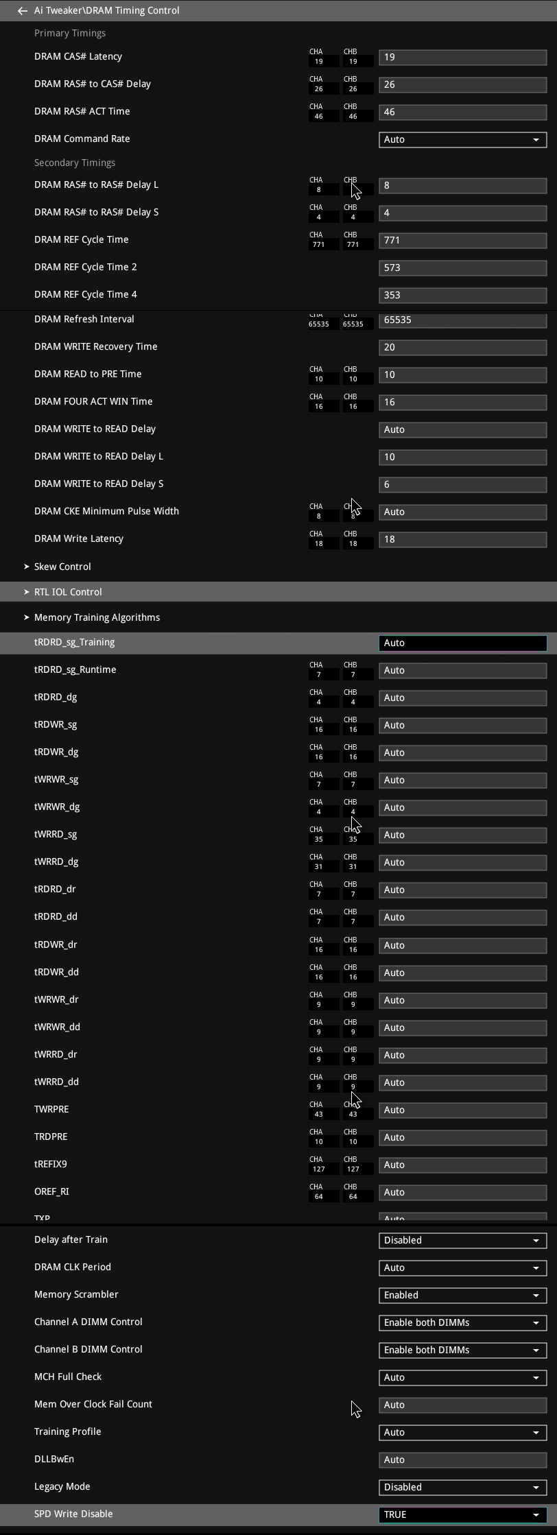Начните с RCD, CL. Не обязательно должны быть одинаковыми, обычно CL идёт меньше чем RCD. RAS сразу пробуйте как RCD+CL+4, до этого значения от него существенная разница, дальше меньше. CWL<=CL. Допустимые значения 9,10,11,12,14,16,18,20. RP можете выставить по RCD, если пойдёт меньше - тоже неплохо, не уверен правда насчёт смысла. RTP без формул. Если не идёт вниз можно попробовать поднять чуть чуть RP. В DDR4 явно связан с WR соотношением 2 к 1 (например WR20\RTP10), физически хранится одно значения и в зависимости от операции интерпретируется. Скрутите FAW до 16(так и оставьте если работает). С таким FAW скручивайте RRD(оба, L обычно больше чем S), возможно поедут на 4 оба. Если до 4 не удалось спустить поднимите FAW до уровня RRDL*4 и попробуйте ещё, хотя это скорее всего уже почти предел. Обычно L>=S. L - SG(Same Group). S - DG(Different Group) Напр. RRD_L>=RRD_S. CKE=5 СCDL>=4 RDRD_DD и прочие подобные можно проигнорировать если у вас нет двух планок на один канал (4 планки). DD-Different Dimm. Тоже самое с DR-Different Rank если у вас одноранговая память. RDWR_SG(DG) и подобные сочетания скручивайте до минимальных рабочих, потом накиньте сверху +2. Как уже отметил обычно SG>=DG. WTR не трогайте он сам спустится когда будете скидывать WRRD_SG(DG) и прочие подобные. Если сам меньше не стал тогда руками скидывать. WR снижать через WRPRE если есть. Если нет или не снижает WR, То скрутите его скажем до 12 или +4 от рабочего, потом дожмёте если не лень будет. RFC явных формул нет, крутить после всего списка сверху. Не пытайтесь найти его минимальное значение если не хотите чтобы память начинала сыпать ошибками от любого чиха. найдите пограничное со стабильностью значение и накиньте сверху 20 или сразу 40. Может реагировать на RAS+RP, RRD, FAW, причём в обе стороны (то есть может "сломаться" если задрать названные), а может и не реагировать... REFi больше лучше. Связан с RFC. REFI сколько память "работает" - RFC сколько "отдыхает". Оба тайминга лучше не пытаться найти предельное значение.Заметно реагируют на температуру. Многие тайминги отзываются и на температуру и на напряжение. Поскольку напряжение может как позволить снизить тайминг, так и увеличить температуру, то середину можно искать очень долго, поэтому лучше бы вовремя остановится. Тестируйте тщательно с перезагрузками, сном, холодным стартом. RTL и IOL вам кто-то другой пусть советует как настраивать, от них у меня голова болеть начинает...