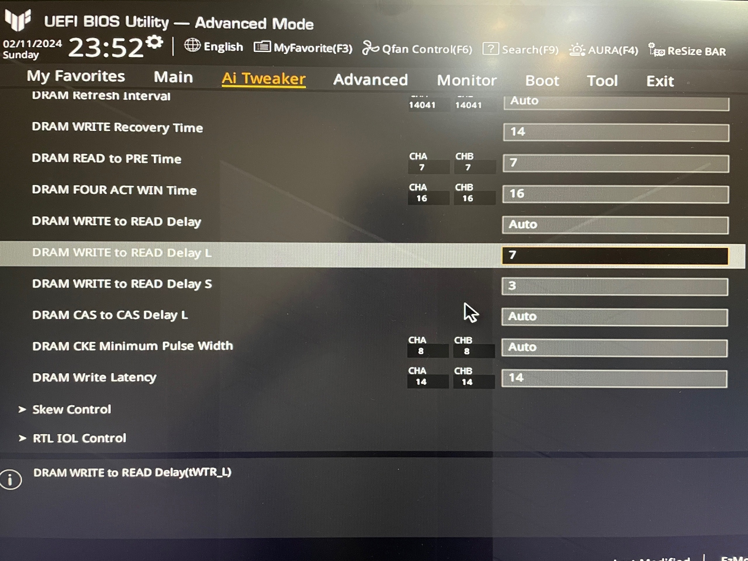 Начните с RCD, CL. Не обязательно должны быть одинаковыми, обычно CL идёт меньше чем RCD. RAS сразу пробуйте как RCD+CL+4, до этого значения от него существенная разница, дальше меньше. CWL<=CL. Допустимые значения 9,10,11,12,14,16,18,20. RP можете выставить по RCD, если пойдёт меньше - тоже неплохо, не уверен правда насчёт смысла. RTP без формул. Если не идёт вниз можно попробовать поднять чуть чуть RP. В DDR4 явно связан с WR соотношением 2 к 1 (например WR20\RTP10), физически хранится одно значения и в зависимости от операции интерпретируется. Скрутите FAW до 16(так и оставьте если работает). С таким FAW скручивайте RRD(оба, L обычно больше чем S), возможно поедут на 4 оба. Если до 4 не удалось спустить поднимите FAW до уровня RRDL*4 и попробуйте ещё, хотя это скорее всего уже почти предел. Обычно L>=S. L - SG(Same Group). S - DG(Different Group) Напр. RRD_L>=RRD_S. CKE=5 СCDL>=4 RDRD_DD и прочие подобные можно проигнорировать если у вас нет двух планок на один канал (4 планки). DD-Different Dimm. Тоже самое с DR-Different Rank если у вас одноранговая память. RDWR_SG(DG) и подобные сочетания скручивайте до минимальных рабочих, потом накиньте сверху +2. Как уже отметил обычно SG>=DG. WTR не трогайте он сам спустится когда будете скидывать WRRD_SG(DG) и прочие подобные. Если сам меньше не стал тогда руками скидывать. WR снижать через WRPRE если есть. Если нет или не снижает WR, То скрутите его скажем до 12 или +4 от рабочего, потом дожмёте если не лень будет. RFC явных формул нет, крутить после всего списка сверху. Не пытайтесь найти его минимальное значение если не хотите чтобы память начинала сыпать ошибками от любого чиха. найдите пограничное со стабильностью значение и накиньте сверху 20 или сразу 40. Может реагировать на RAS+RP, RRD, FAW, причём в обе стороны (то есть может "сломаться" если задрать названные), а может и не реагировать... REFi больше лучше. Связан с RFC. REFI сколько память "работает" - RFC сколько "отдыхает". Оба тайминга лучше не пытаться найти предельное значение.Заметно реагируют на температуру. Многие тайминги отзываются и на температуру и на напряжение. Поскольку напряжение может как позволить снизить тайминг, так и увеличить температуру, то середину можно искать очень долго, поэтому лучше бы вовремя остановится. Тестируйте тщательно с перезагрузками, сном, холодным стартом. RTL и IOL вам кто-то другой пусть советует как настраивать, от них у меня голова болеть начинает...
