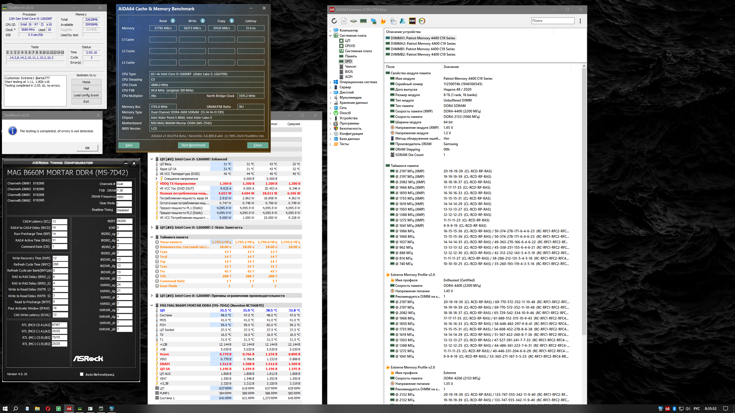 Имею 4 плашки b-die по 8гб на MSI B660M MORTAR. Запустил на частоте 4000мгц и как-будто стабильно. Как-будто потому, что TM5 Extreme проходит без ошибок, но почти за 4 часа, вместо положенных 3х (так было на частоте 3600). Prime95 полтора часа без ошибок. Так почему так неправильно медленно проходит TM5?