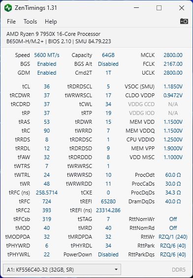 Здравствуйте! Имею Kingston FURY Beast Black [KF556C40BBK2-32], чипы определяются, как микрон, а это, вроде как, плохо. Поставил в ХМР 5600 40-40-40 на 1.25В, имеет смысл что-то менять, ужимать?