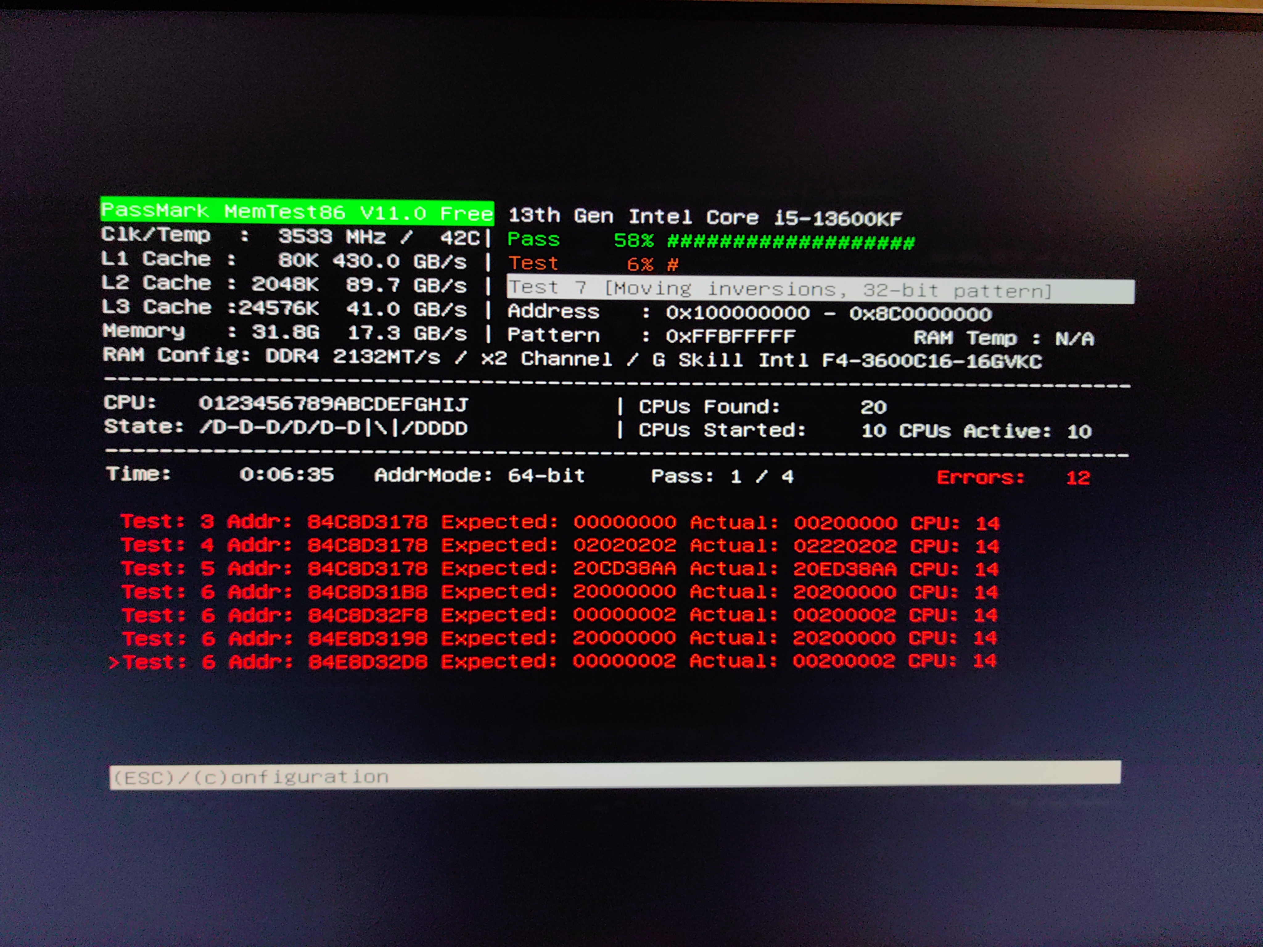 По отдельности во втором слоте ошибок не было... Каждую отдельно прогнал минут по 8. Если ставить сразу две то такая вот ошибка постоянно (CPU:14). Я не пойму это код ошибки или номер ядра цпу Попробую прогнать без Е ядер. Может 4ый слот на материнке поганый? Надо его отдельно проверить