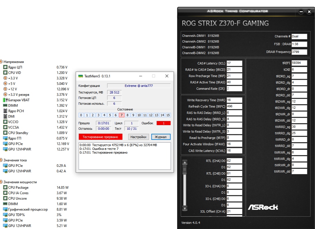 И ещё такой вопрос. Хочу попробовать с частотой 3800 и таймингами 17-21-21-40 2T. Но берётся только при напряжении 1.4В. Нормально на постоянку оставлять с таким напряжением или плохо? Комп в основном используется изредка поиграть. Update. Запустил память на 3800 с теми настройками, что раньше тест проходил хорошо, но отличие в том, что тогда не была пройдена тренировка, и что процессор был в разгоне до 5Ггц и кольцо 4500 (сейчас тесты на всём стоковом делал). Так вот тесты с ошибками завершаются сейчас. Не понимаю, в чём причина, ведь работало. Что могло повлиять, что не было тренировки или разгон проца помогал?