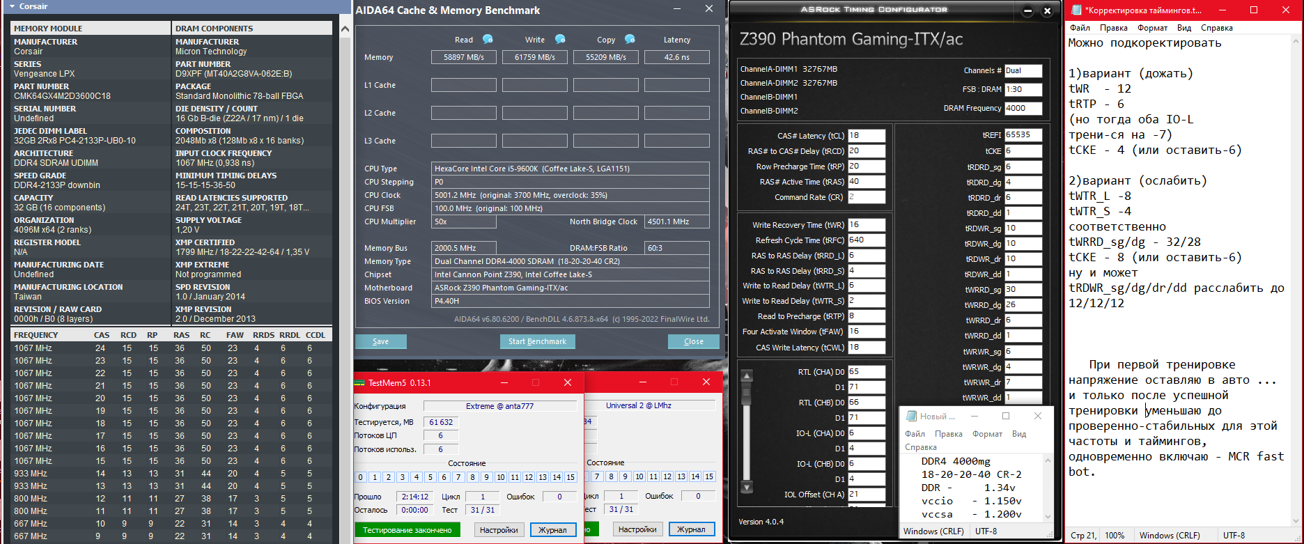rvspost Благодарю за развернутый ответ) И, в общем получилось так.... (небольшой отчет... может в будущем кому и поможет) Память Corsair CMK64GX4M2D3600C18 (2x32gb) c чипами Micron 16 Gb Rev-B (Z22A / 17 nm). Родной XMP профиль - 3600 18-22-22-42 Остановился на двух вариантах (пока не решил каким пользоватся)... напруги, вторички и третички почти идентичны. 1й) 4000 18-20-20-40 CR-2 1.34v 2й) 3800 16-18-18-36 CR-1 1.34v