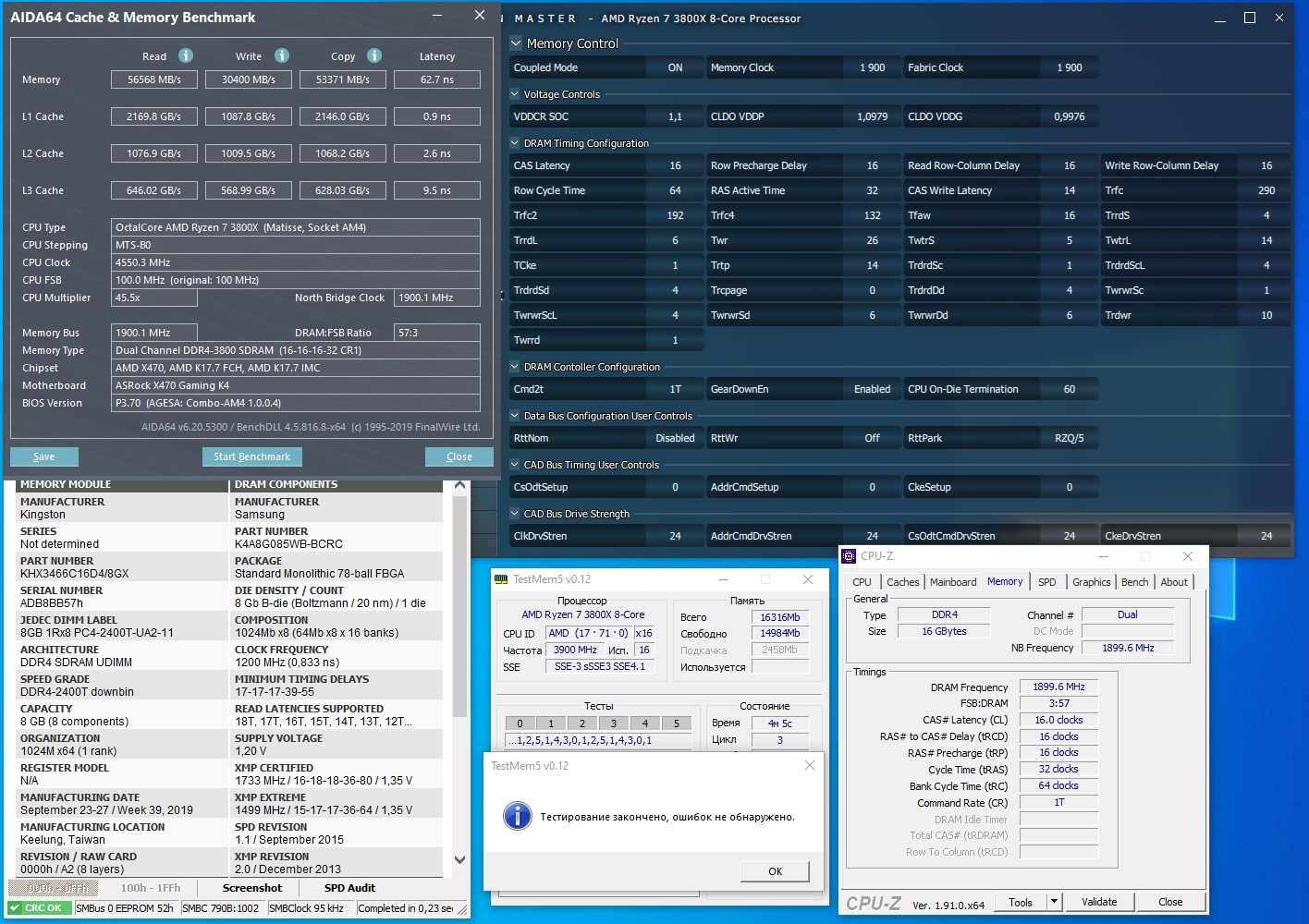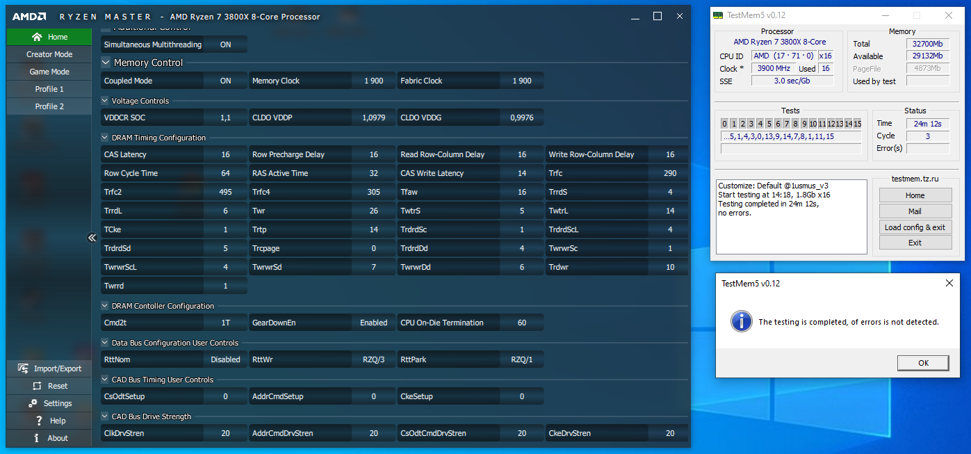 Значит 2х8гб. Остановился (именно остановился, что то не крутил, что то не дожал) на 3800/1900 16-16-16-32 64 кр1 60ом 1.390в. Это стабильно работает на 2х системах и тд. Проходит все бенчи, на различных пресетах (тм5 и деф и кастомный вариант из 15ти шагов из шапки, мемтес86+ разных версий и тд). Вопросов нет. И ренднрят, и играют, и стримят и тд. Плюс планки в самых жёстких условиях не сильно горячий.