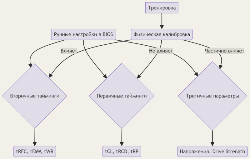 Write Leveling: Корректировка задержек между DQ/DQS сигналами. Пример: При частоте 4000 МГц погрешность синхронизации ≤ 0.3 нс; ZQ Calibration: Настройка выходного импеданса (240 Ом ±5%); Command Training: Оптимизация таймингов CAS/RAS; VREF Training: Калибровка опорного напряжения (0.45-0.6V); Напряжения (VDDQ, VPP) обычно сохраняются, но Drive Strength может корректироваться; Вторичные тайминги (tRFC, tRRD_S): Частично переопределяются тренировкой (до 15% коррекции); Первичные тайминги (tCL, tRCD, tRP): Остаются неизменными, если заданы вручную;