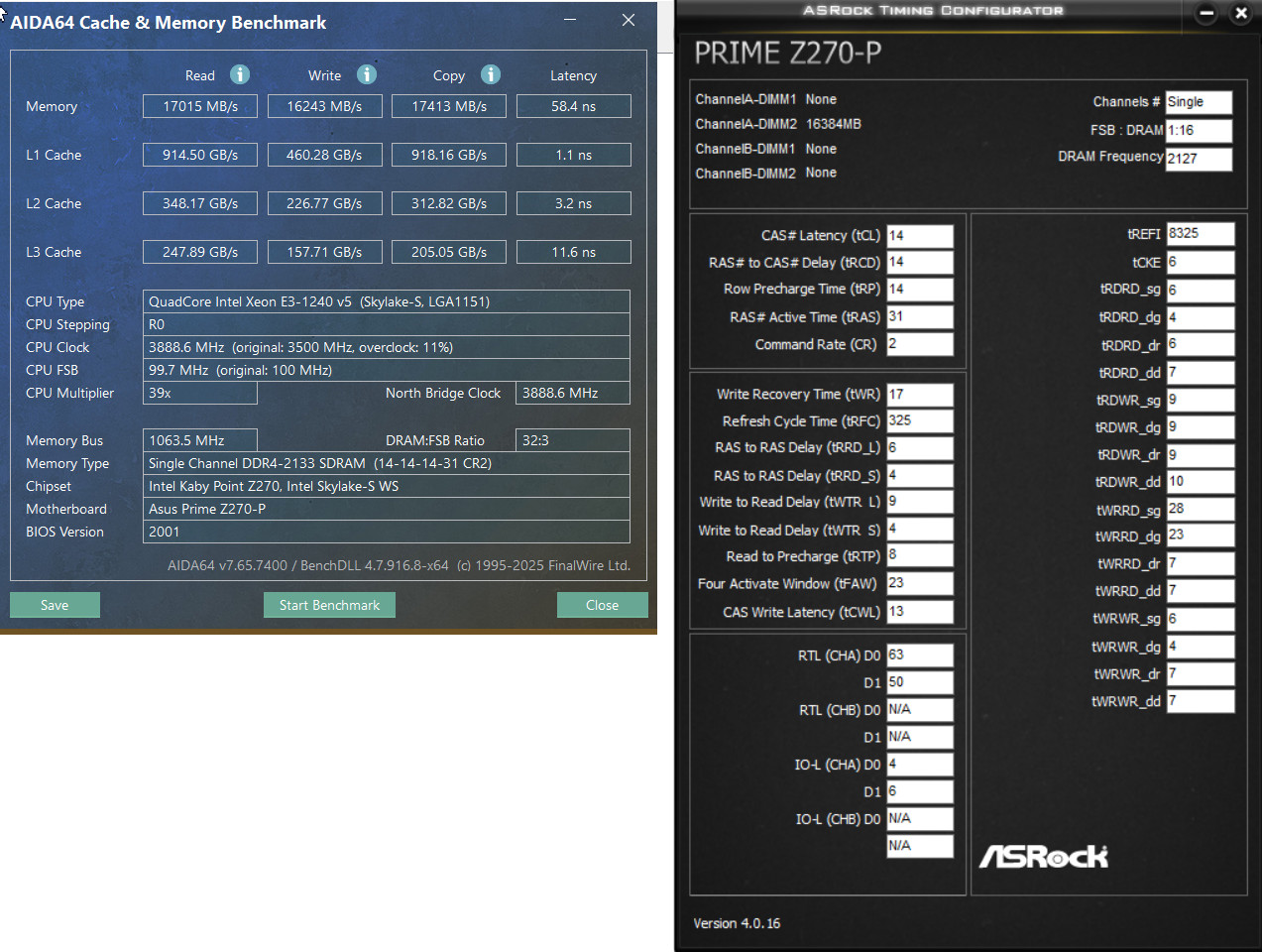 Процессор: Xeon E3-1240 v5 (Skylake, LGA1151) Официальная поддержка: DDR4-2133 Максимальный разгон через BCLK: ~5% (риск нестабильности PCIe/SATA) Материнская плата: Asus Prime Z270-P Поддержка DDR4 до 3866 МГц (теоретически) Слабый VRM для памяти (4-слойная PCB) Модуль ОЗУ: Kingston HX424C16FB/16 (Micron D9SRJ, 1Rx8) Номинальные характеристики: DDR4-2400 16-16-16-39 @1.2V Потенциал: DDR4-2666–2800 @1.35–1.4V