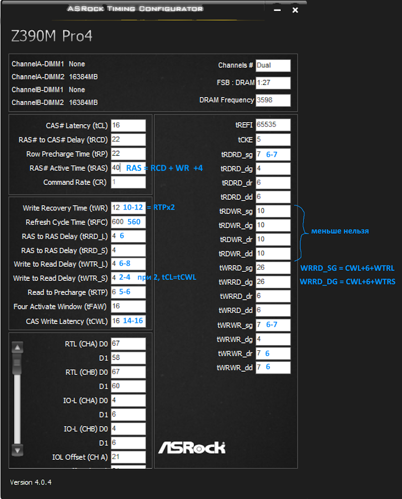 tRASmin=tCL+tRCD+2 WTRS/L устанавливаются в биосе через WRRDdg/sg согласно формуле: WRRD_sg=6+CWL+WTR_L WRRD_dg=6+CWL+WTR_S WR - через WRPRE (для матплат ASUS): WRPRE=4+CWL+WR RTP - через RDPRE (для матплат ASUS) RDPRE=RTP
