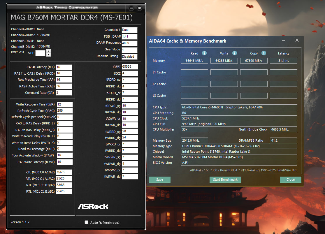 Развлекаюсь перед НГ, как могу... 10600K 5.1 Z490M Prime Team Group T-Force DARK Pro (TDPGD416G3200HC14ADC01) 2x8 Удалось стабилизировать (TM5, Memtest86 11.2) 4266MHz 16-15-15-36 (TREFI 65535, TRFC 360). Напруга канеш запредельная (vram 1.53, IO 1.31/SA 1.31). Результат слабый какой-то, есть замечания? (RTL не настраивал, сток) Латентность бывает 39.9/39.5. AIDA64