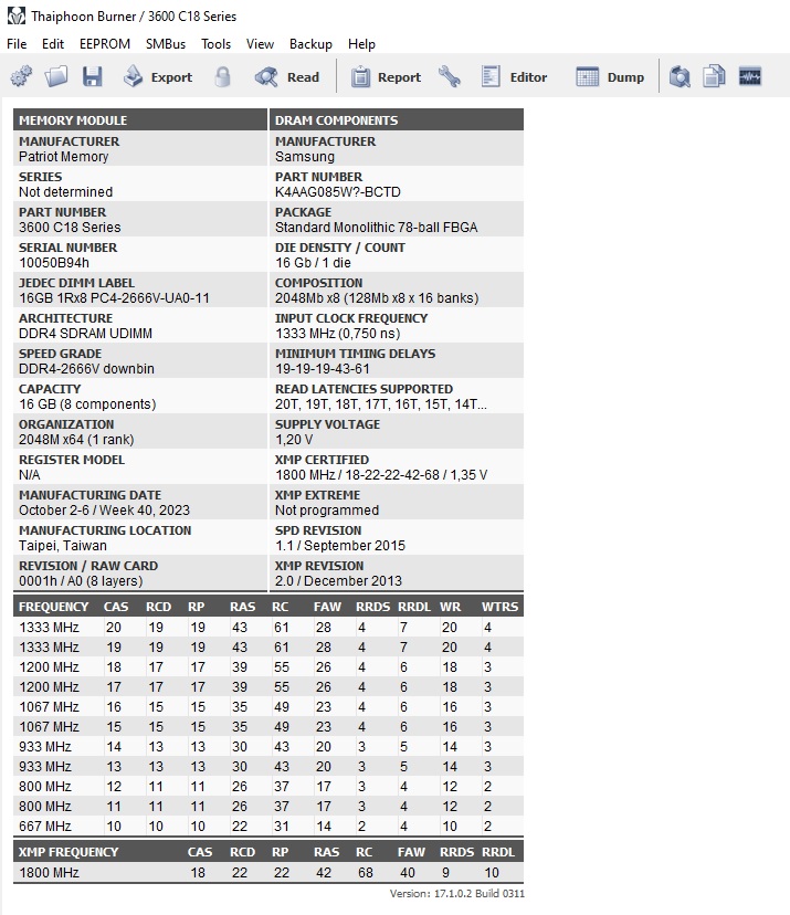 Ревизия BCTD характерна для C-Die. D-Die имеют маркировку K4A8G085WB-BXXX (смотрим Тест разгона DIMM на чипах Samsung 8 Гбит D-Die там K4A8G085WD). 16 Gb / 1 die (2 ГБ на чип) -> Характерно для C-Die/M-Die (D-Die имеют 512 МБ на чип). DDR4-3600 18-22-22-42 1,35 В -> Типично для C-Die. 2048M x64 (1 rank, 8 чипов) -> Совместимо только с 16 Gb модулями.