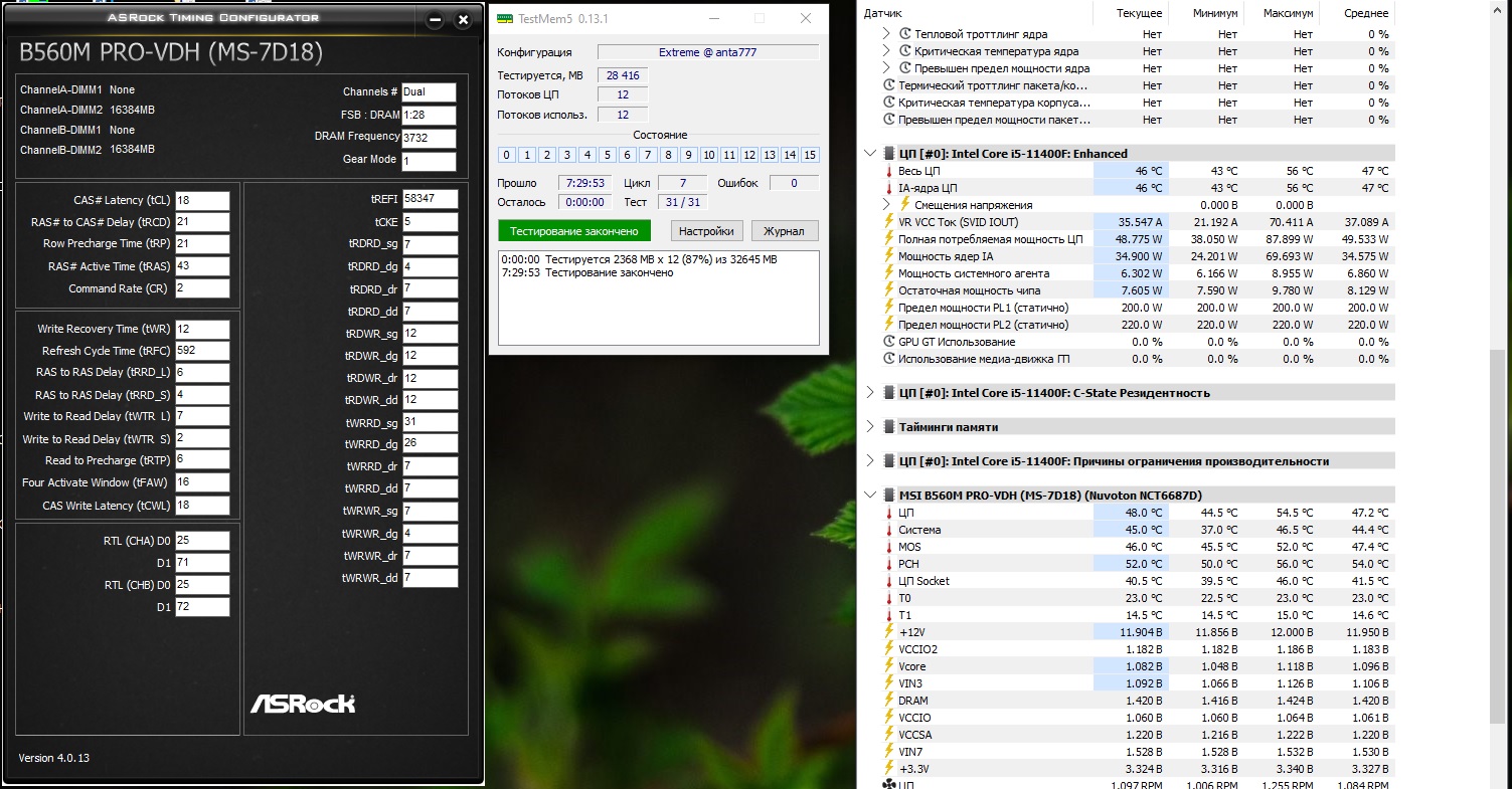 Bigsun, ночью прогнал еще 6 циклов absolutnew с VDIMM - 1.44v, не одной ошибки не появилось, с напряжением ниже не едет. Сейчас выставил: SA - 1.3v, VDDQ - 1.28v, VDIMM - 1.44, VPP - 2.6v, 3600мгц 16-21-21-41, после 2 часов теста absolutnew появились ошибки (как и в прошлый раз). На 3600мгц 16-20-20-40 все так же нет старта. Попробовал посмотреть, изменилось ли что-то на более высокой частоте, на 3800-3866 (18-22-22-42) так же ребутается система, либо сыпит ошибки. Скорее всего 3733мгц предел для моего комплекта. Так же попробовал подобрать сопративления с помощью GSAT, на удивление мат.плата вроде как их выставляет корректно, получилось 80-48-48, оставил в авто. Куда можно копать дальше? Благодарю за вашу помощь.