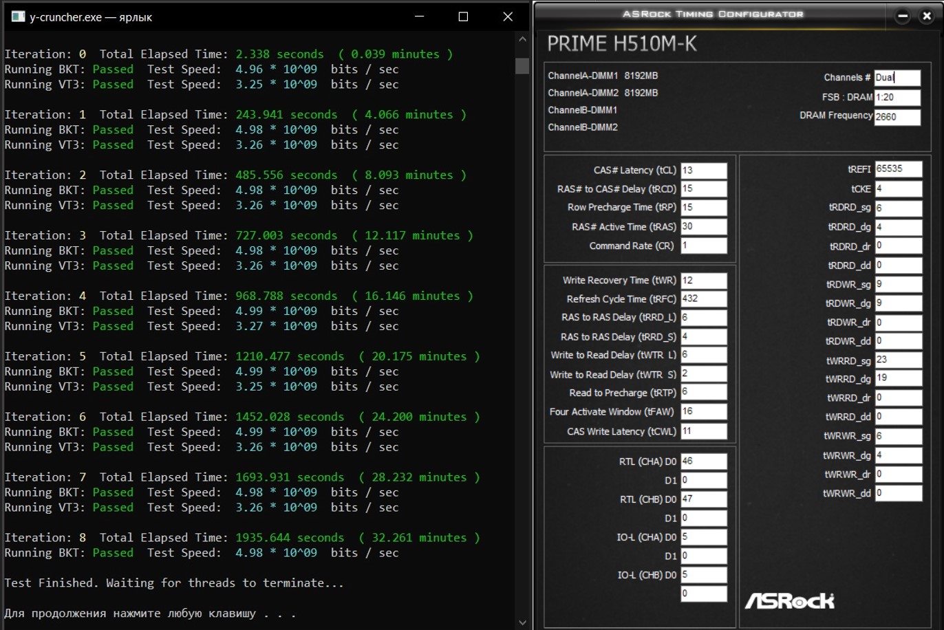 в TM5 : usmusv3 20min pass superlight 36m pass universal 40m pass extreme 2.2h pass в OCCT: cpu 30 min pass memory 1h pass cpu+memory 1h pass Prime95 torture 30m pass y-cruncher VT3 BKT 30m x2 pass :