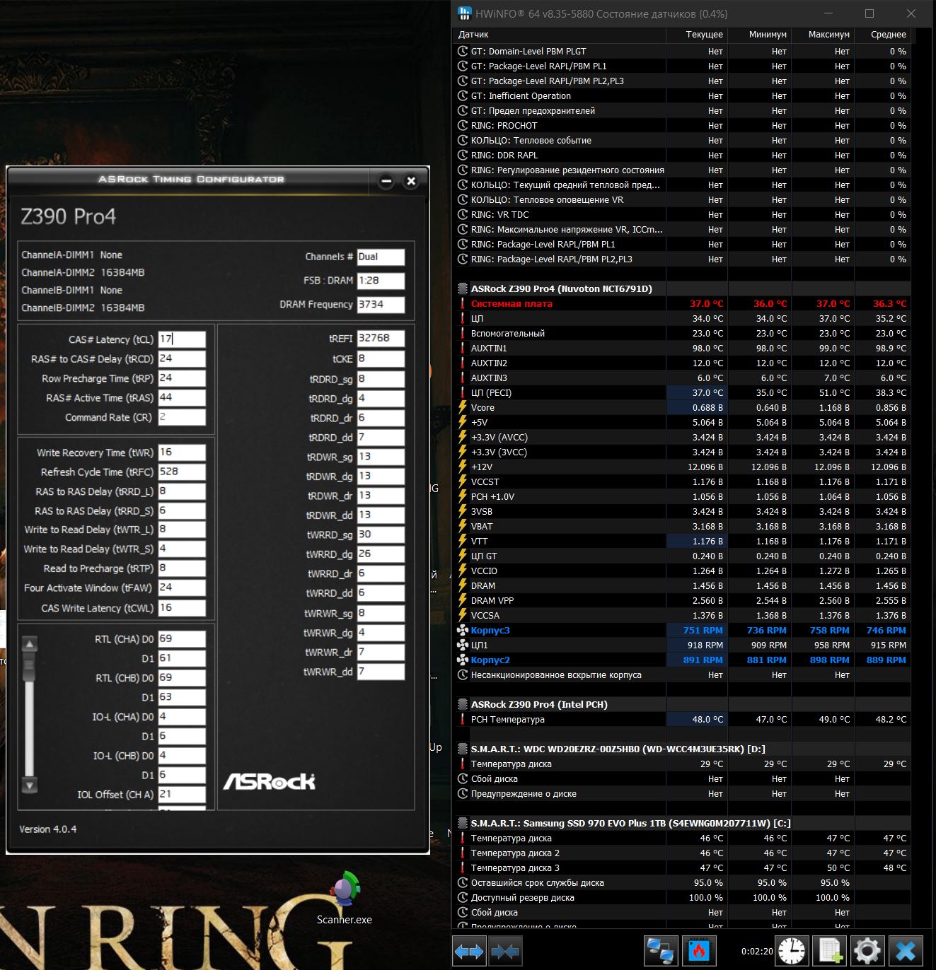поставил tRFC 736 VCCIO 1.2 (в HWINFO ~1.218) VCCSA 1.25 (~1.27) ODT как вы написали (вроде бы)