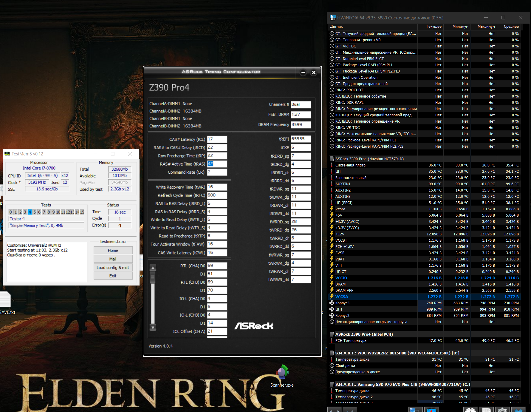 Потом поменял местами плашки, пробовал ещё вариации с разными частотами, иногда запускалось с меньшими напряжениями (в Auto) но бсоды почти сразу либо ошибки мемтеста. Вариант Bigsun на 3600 тоже бсодил (но выставились меньшие vccio и vccsa).