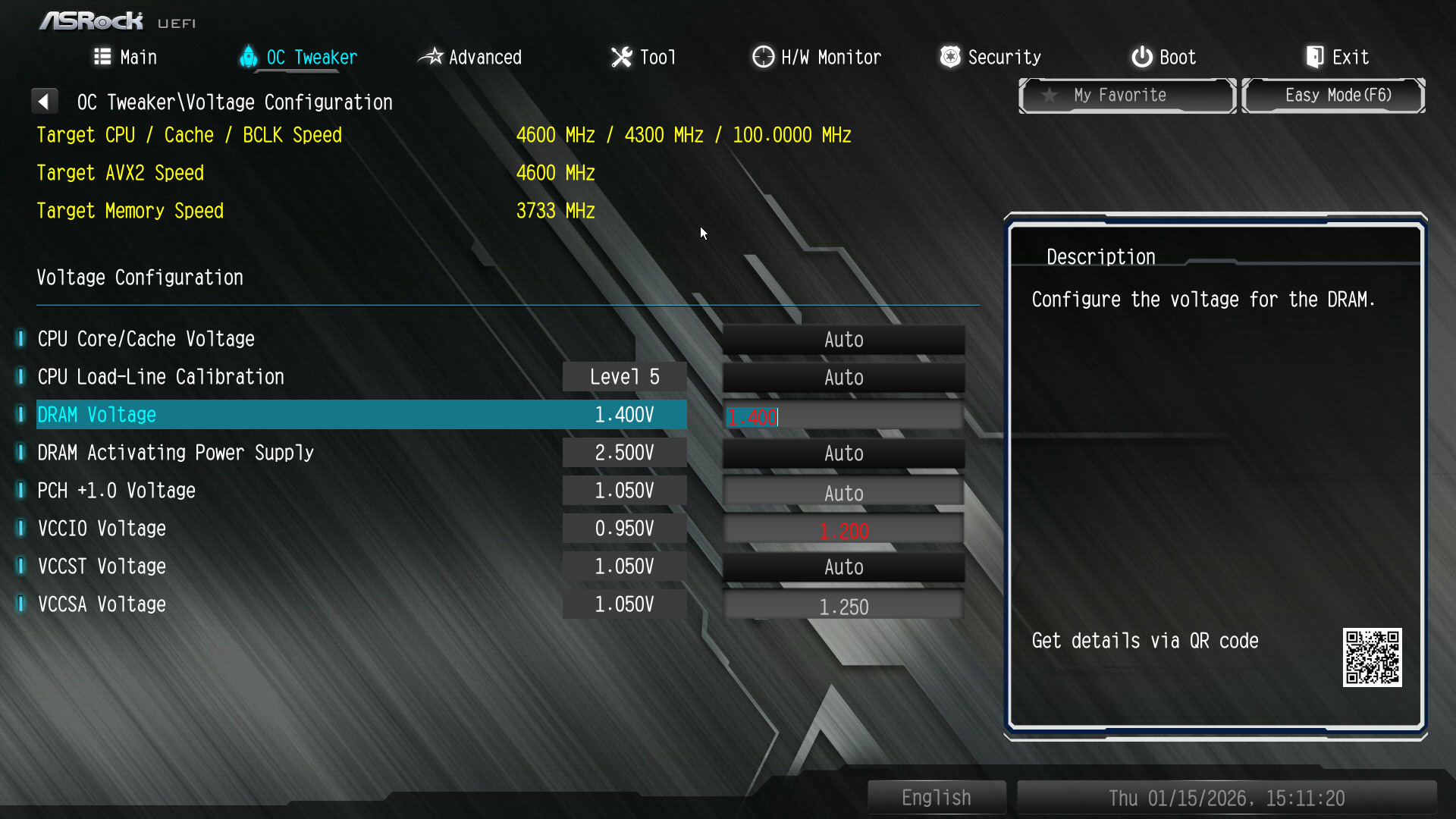 На память 1.36-1.38 попробуй выставить, потом скрутишь если что. И думаю тебе стоит сначала найти стабильную частоту, так что поставь все основные тайминги с большим запасом. Типа 22-24-24-44 а все те что справа в Асрок тайминг конфигураторе - выстави в авто. На частоте выше 3600 уже нужно будет переключаться в CR2