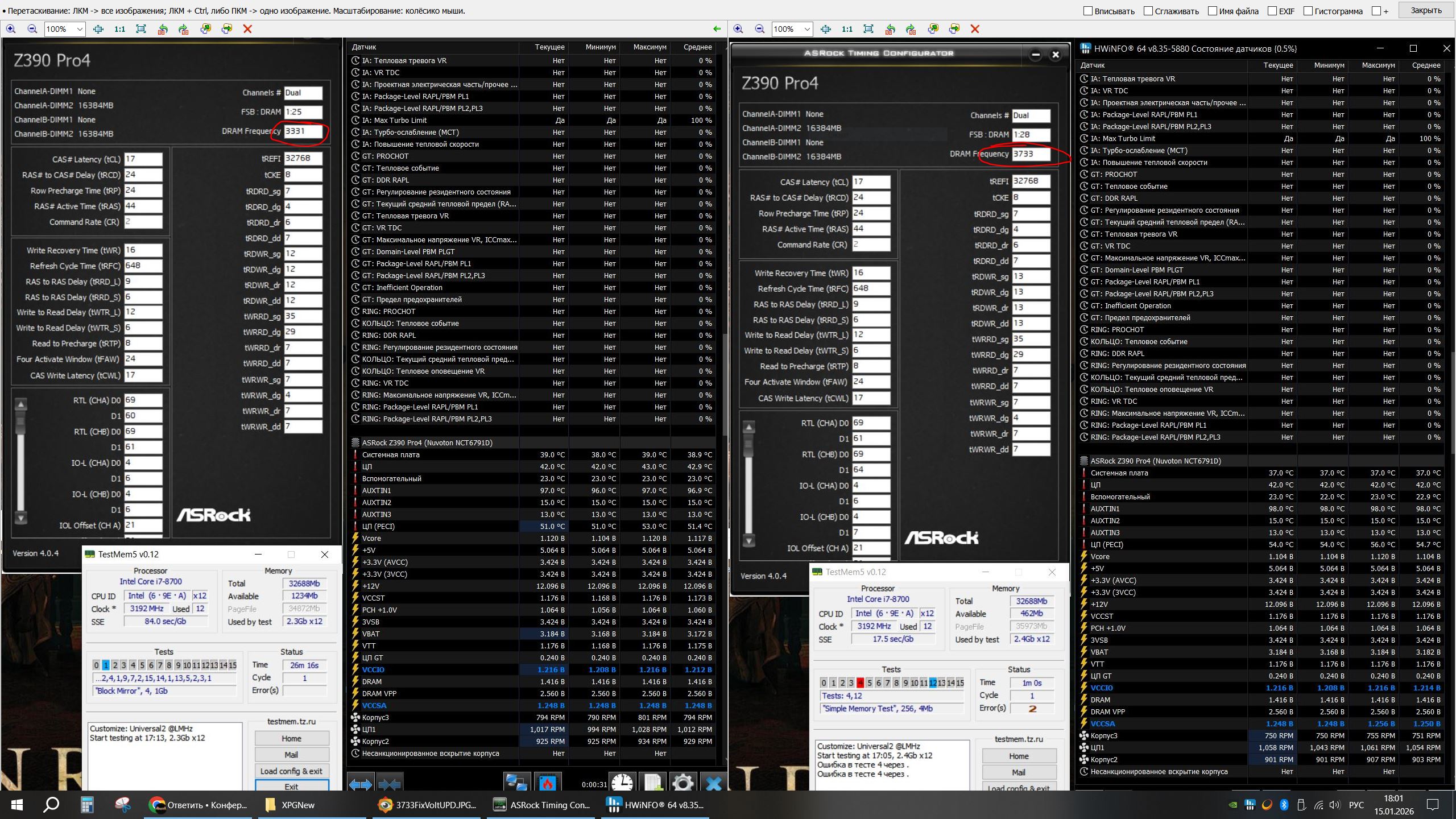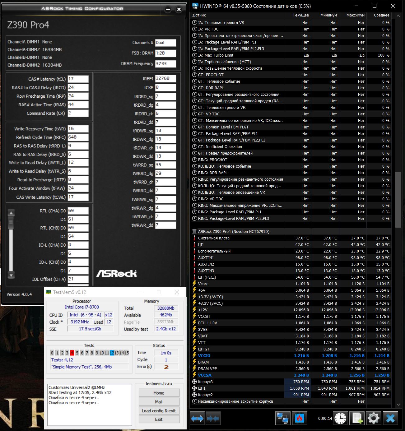 Добавлено спустя 54 минуты 32 секунды: Всё при тех же настройках, таймингах, менял только частоту: Ставлю 3333 - тест пол часа, полёт нормальный. Ставлю 3466 - даже пост не проходит Ставлю опять 3733 - грузит винду, не бсодит (но в тестмем ошибки) ничего не понимаю