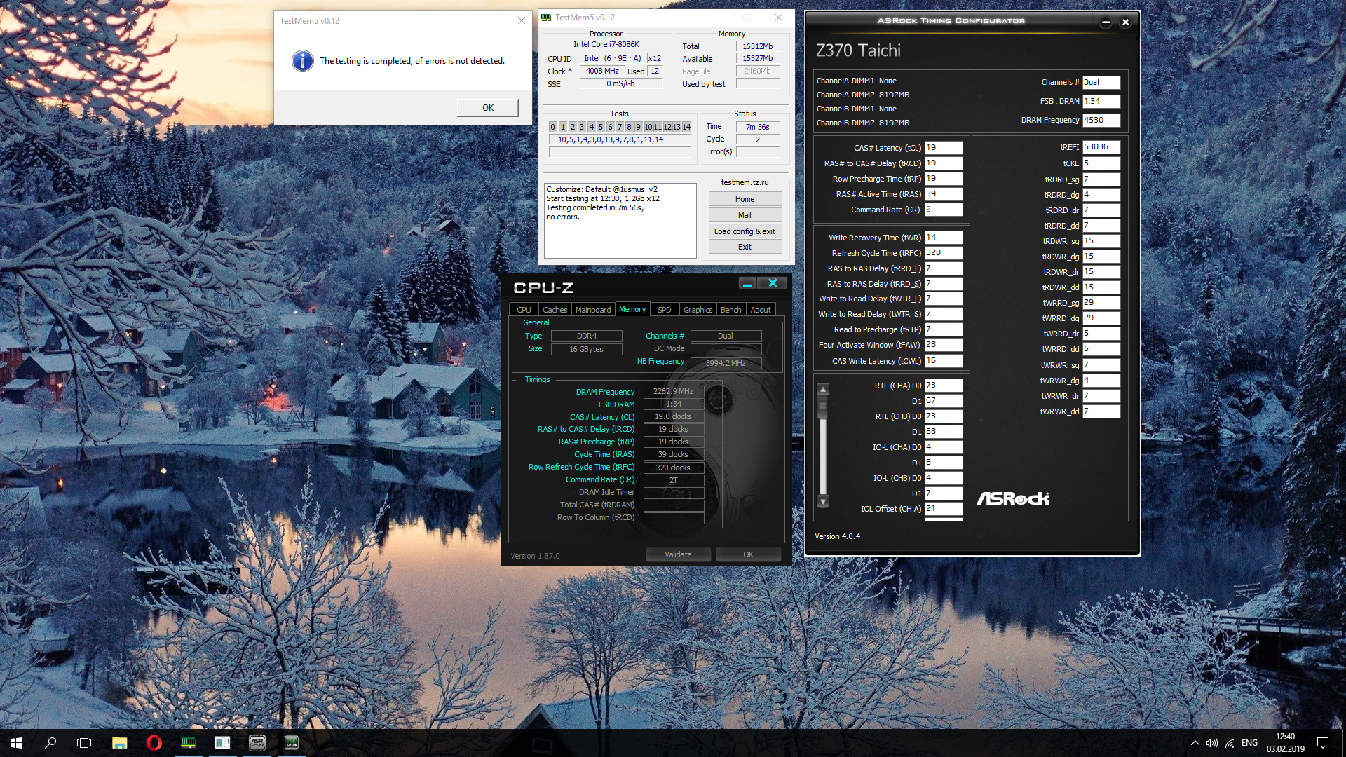 Ещё хотел проверить только 2 модуля из 4-х, на какой максимальной частоте они поедут, но ошибся и отключил один канал, но получил что-то типа этого: 4500 при 19-19-19-40-2Т (1.45/1.3/1.35). Но стабильность не проверял. Пока мудрил, плата перестала стартовать, даже кнопка Safe Mode на плате не помогла, пришлось Clear CMOS делать, но профили сохранились, благо я сохранил их заранее. 2 модуля в двухканальном режиме так и не проверил.