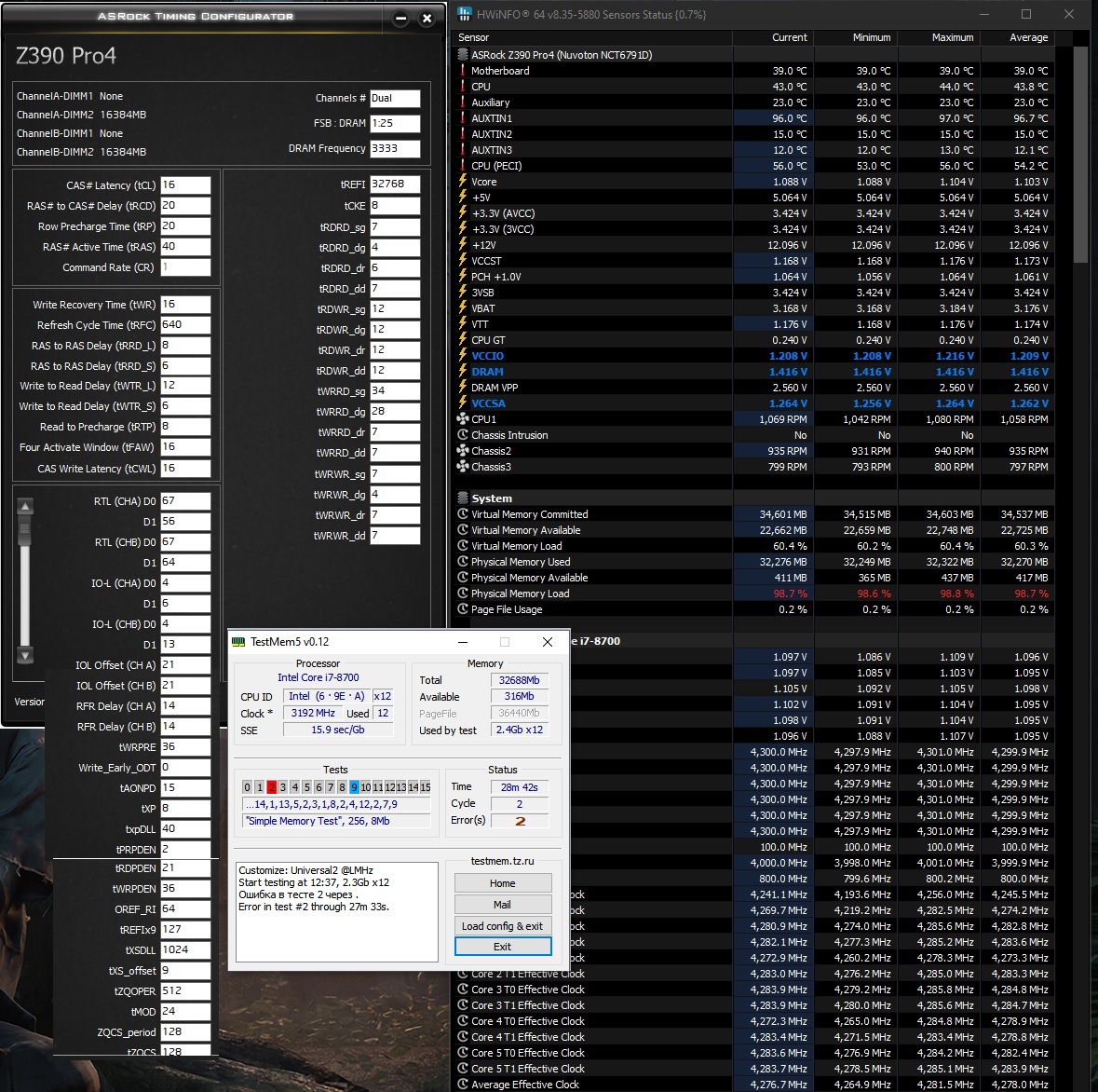 Тайминги, отвечающие за стабильность: tREFI tRFC tWR tRRDS tFAW tWTRS. Покажи, какие тайминги получились на 4800? ... И напряжения покажи, какие получились. Можно просто выписать сюда вручную.