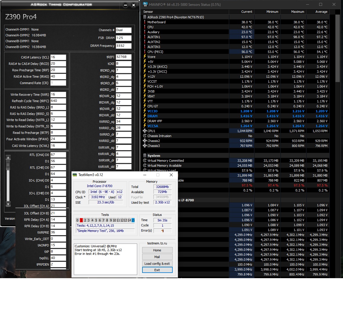 Это уже очень хорошо, что аж на 2-м цикле. Это значит, мы почти у цели -) Обычный перегрев. Опускай VDRAM с 1,4 В до 1,37В и ниже. Правильно тебе пишут, tFAW=24 при tRRDS=6. tFAW как раз и создан, чтобы память не слишком нагревалась. Уменьшая tFAW, ты увеличиваешь производительность, но и увеличиваешь температуру. tFAW (Four Activate Window) - это окно времени, когда КП разрешено подать команду активации строки (ACTIVATE) не более 4 раз. Физический смысл в том, что команда ACTIVATE - самая энергозатратная операция для чипа. Она вызывает резкий скачок тока (Current Spike). Если разрешить контроллеру долбить память активациями строк без ограничений, то будет рост тока, перегрев и просадки напряжения на памяти. DDR4-3333 не обязана держать tCL=16, делай выше. Думаю, это основная причина ошибок. 16 находится на грани стабильности видимо. tCL=17, tRAS=42; VCCSA = 1,25 В;