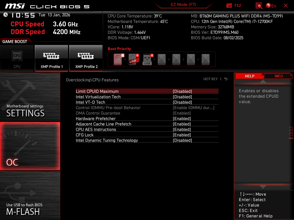 Виртуализацию выключил. CR1 принудительно не ставил, оно у меня в "Авто" (ниже на скрине видно будет) - МП сама CR1 выставила. Разве может быть нестабильность, если МП сама так выставила?